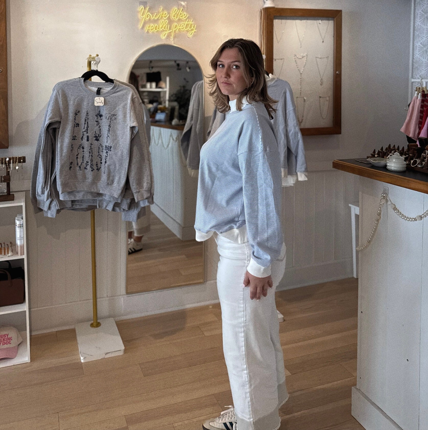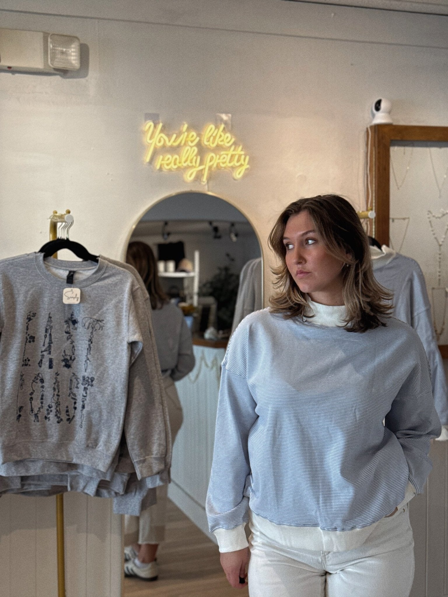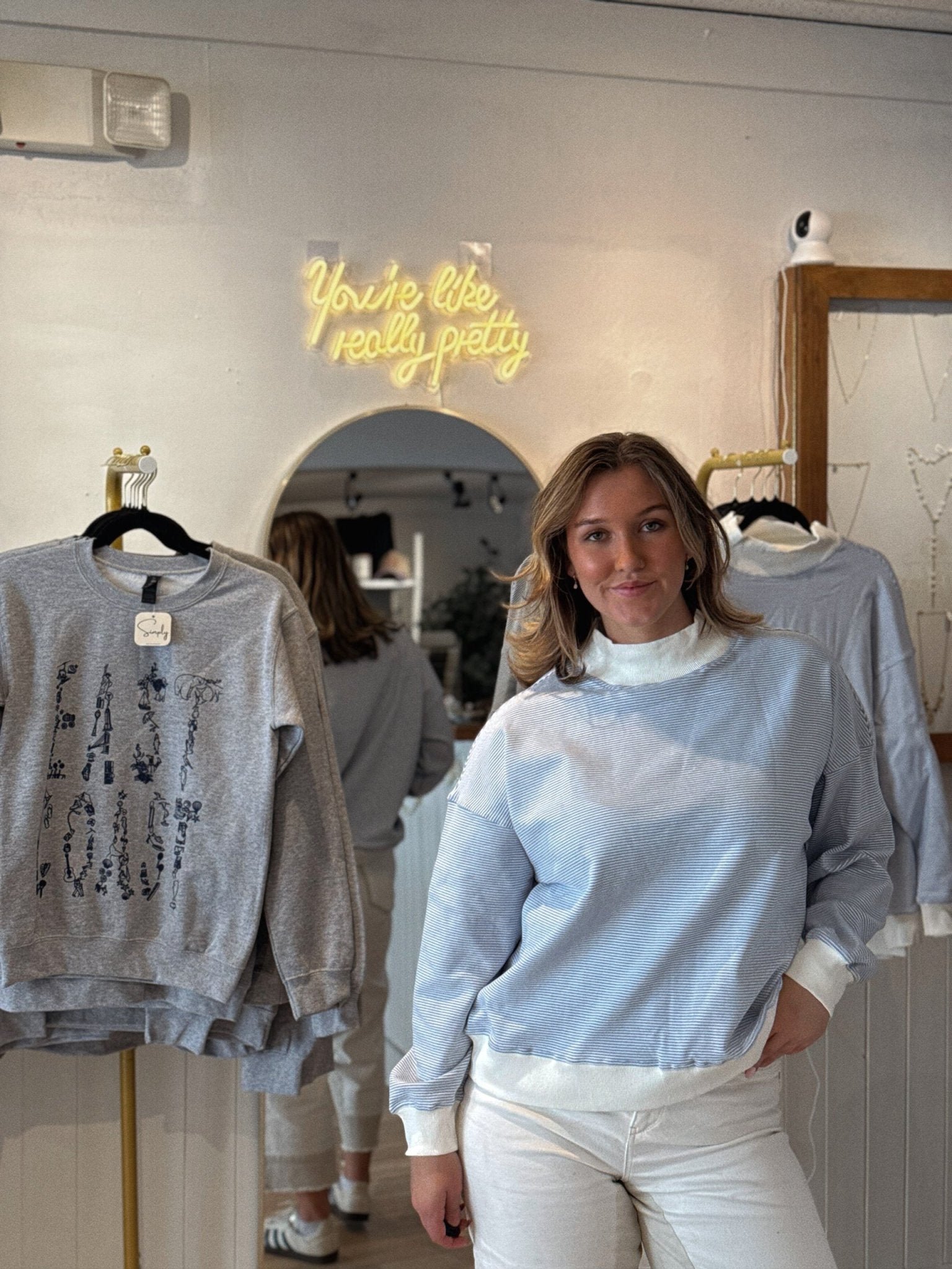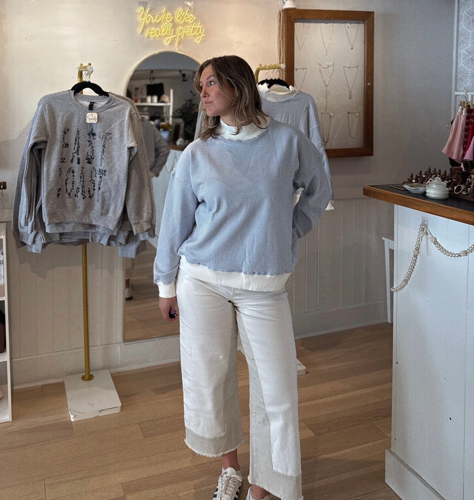 Elevated, refined, and effortlessly timeless, the Blueberry Striped Mockneck reimagines a classic silhouette with understated sophistication. The perfect piece for a sunset walk on the beach! Crafted from premium, ultra-soft cotton, this piece features crisp blue striping and a sculpted mockneck that frames the neckline with quiet elegance. The tailored yet comfortable fit creates a clean, polished profile—perfect for layering beneath structured blazers or styling on its own for a chic, minimalist statement.