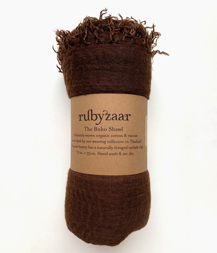Our Boho Shawl is a delicately woven organic cotton & viscose blend. Hand-dyed by a Fair Trade weaving collective in Thailand. This gauze beauty has a naturally fringed eyelash edge and casually accompanies all styles 72” x 39”