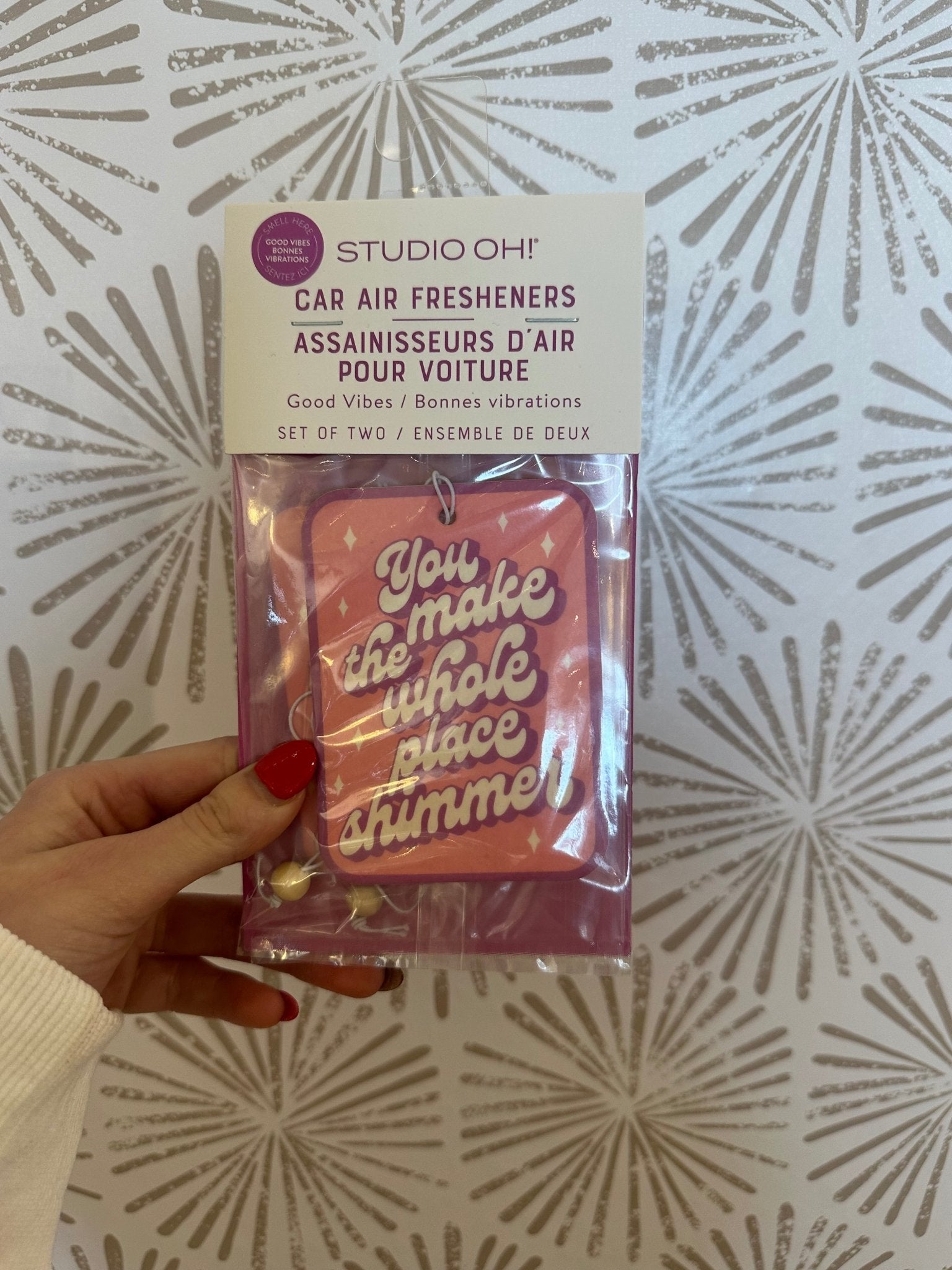 Turn every drive into a delightful sensory experience with the You Shimmer Car Air Freshener from Studio Oh! Designed to bring vibrant color, uplifting fragrance, and long-lasting freshness to your car, these air fresheners are more than just practical—they’re a fun and stylish way to enhance your daily commute. Each package includes two air fresheners, so you can mix and match designs between cars, keep a spare tucked in your glove box, or share one with a friend for a little extra sparkle on the road.
