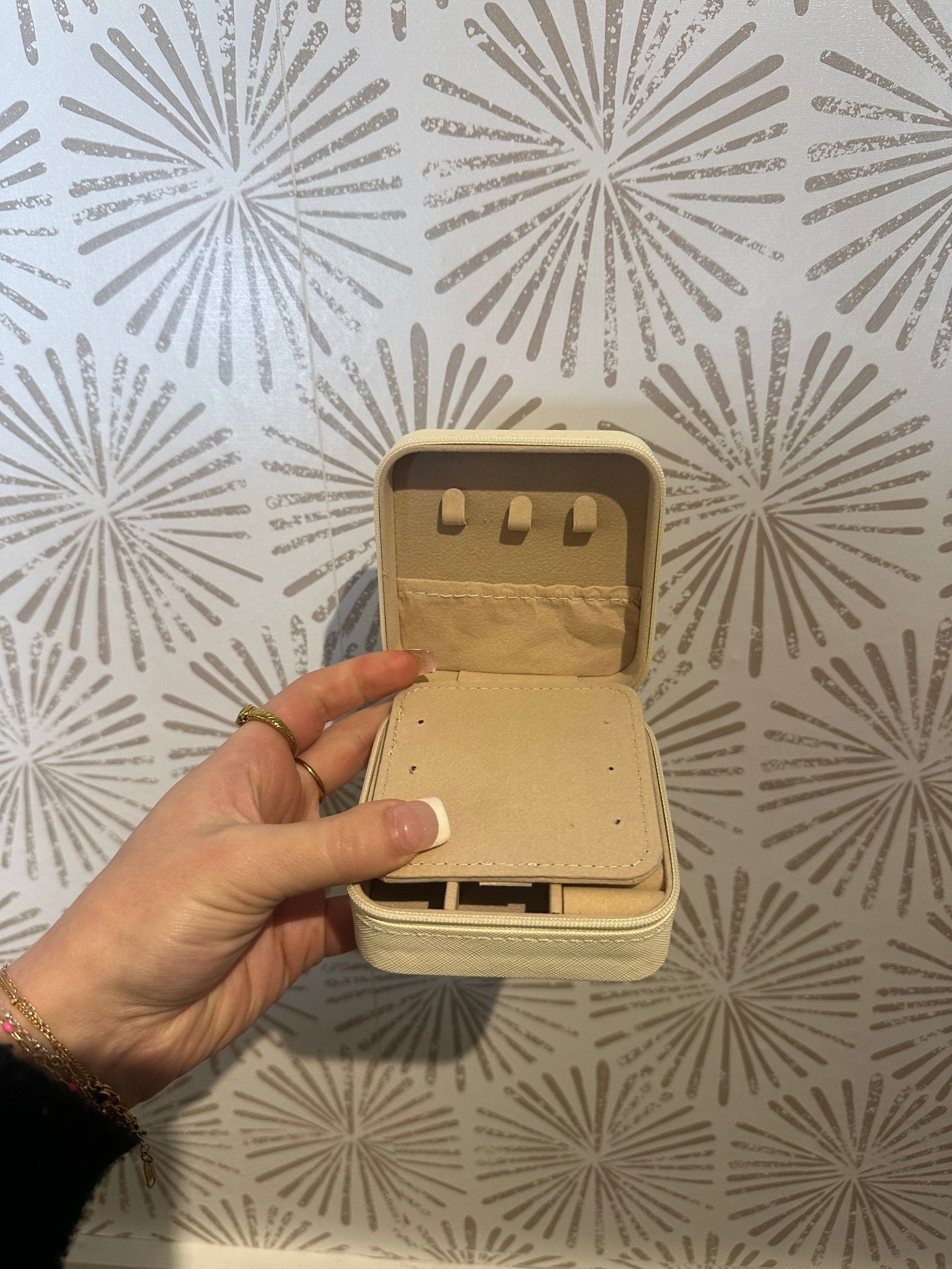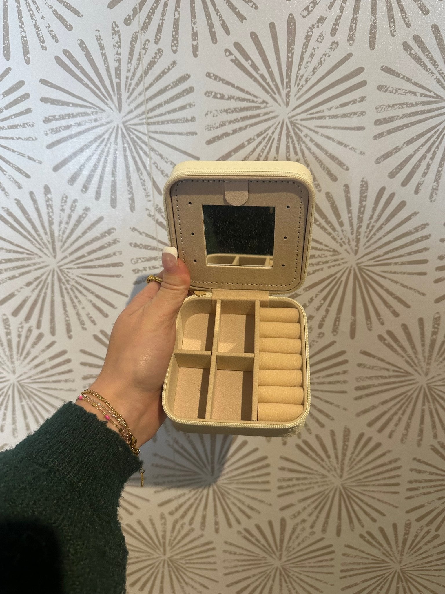 This Blue Floral Print Jewelry Box is a stylish and functional travel accessory made from durable PVC material. Its compact, square design is perfect for on-the-go use, offering a convenient zipper closure for secure storage. Inside, it features multiple compartments for organizing your jewelry, a mirror for easy access and touch-ups, and a dedicated necklace hanging feature to prevent tangling. Ideal for keeping your precious pieces safe and organized while traveling, this jewelry box combines practicality with a charming floral aesthetic. Material: PVC 100% Size: 3.75" x 3.75"