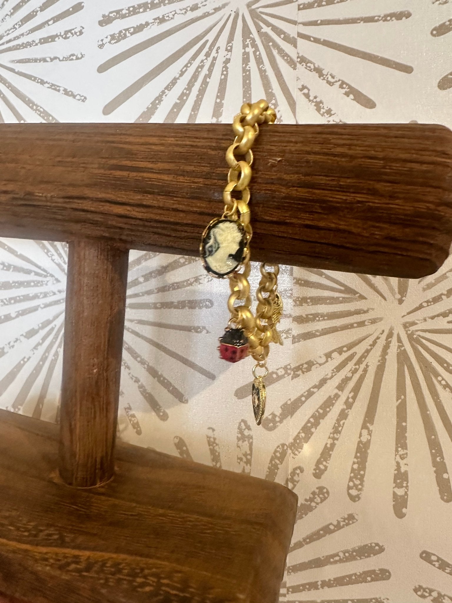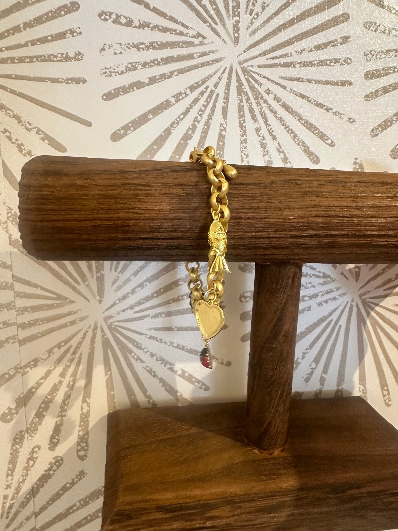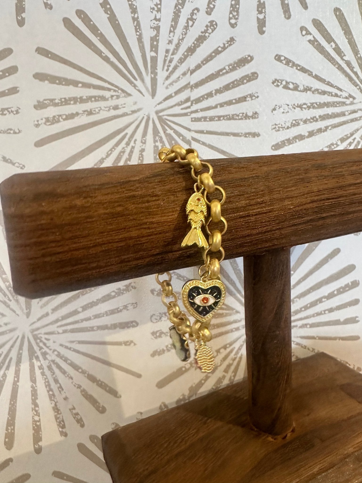 Measuring 6.5 inches long with a 1-inch extension, this adjustable bracelet ensures a comfortable, customizable fit. The centerpiece is a curated collection of gold charms, each thoughtfully selected for both style and symbolism. A delicate cameo adds a classic, vintage-inspired touch, evoking timeless elegance. A fish with a crystal eye brings luck, prosperity, and a touch of sparkle, while a ladybug represents good fortune and joy. Finally, a heart charm with an eye motif blends romance and protection, creating a meaningful, layered story in a single piece.