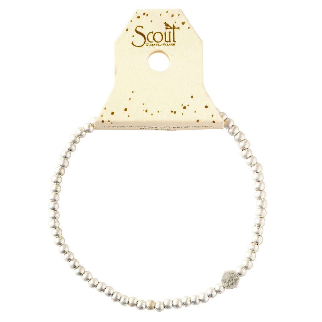 Simple yet sophisticated. Mix up your stack by adding a few stackers in mixed metals. Each bracelet includes an engraved hexagon Scout logo bead. • Materials: 3mm round brass beads, brass logo bead, stretch cord. • Beads are on stretch cord so the bracelet can fit a variety of wrist sizes. •