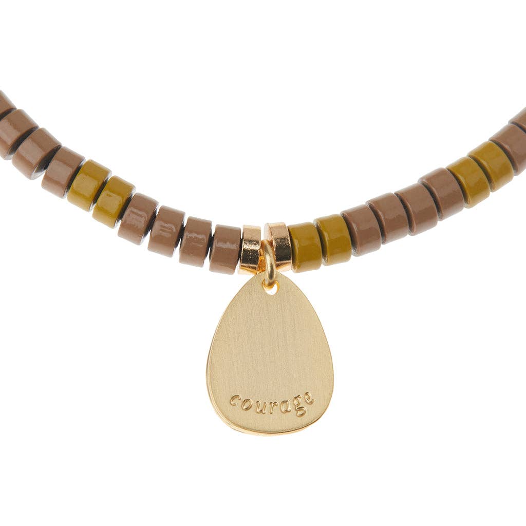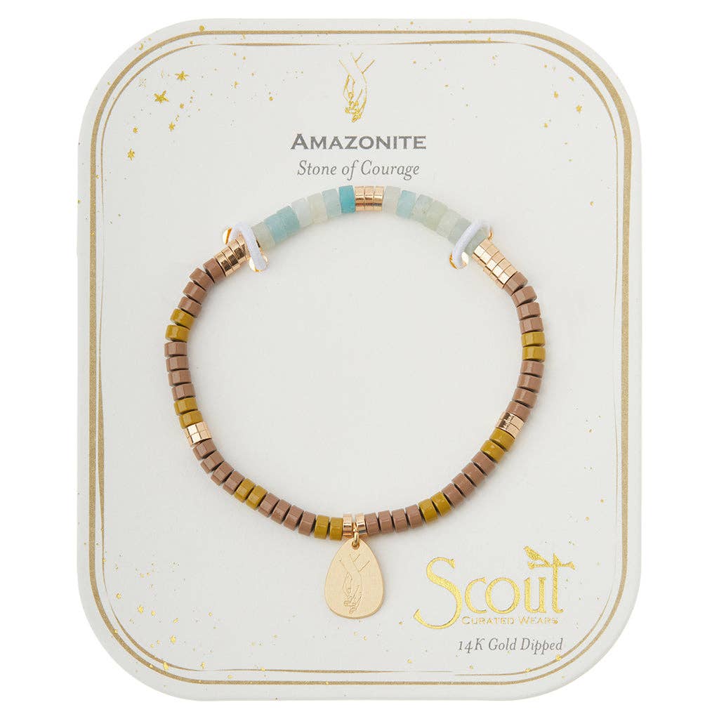 Crafted with purpose. Semi precious stones with positive properties and enamel beads incircle an icon charm engraved with a positive intention. • Materials: Real semi-precious stone beads & enamel beads, stretch cord, Sterling Silver dipped charm. • Every charm is engraved with an icon that reflects the stone's properties. • Beads are on stretch cord so the bracelet can fit a variety of wrist sizes. • Presented on cards that tell the meaning and properties of each stone. Amazonite: Stone of Courage