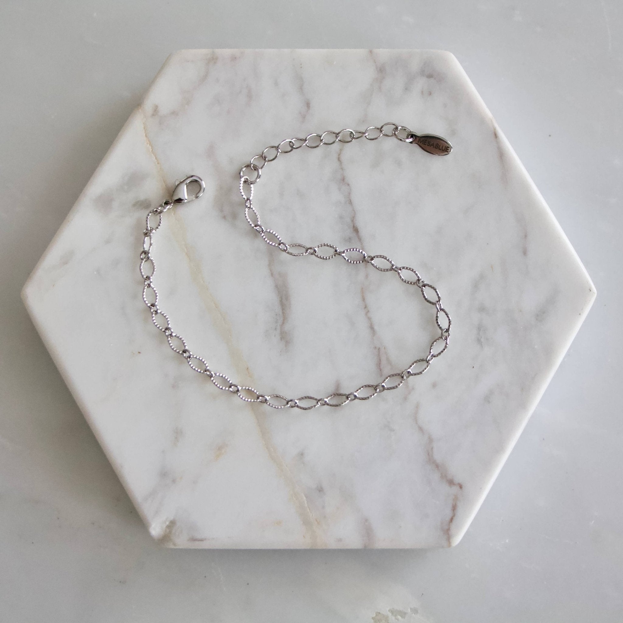 Details: • MATERIAL: silver plated • LENGTH: 6" + 2" extender chain • CLASP: Spring ring
