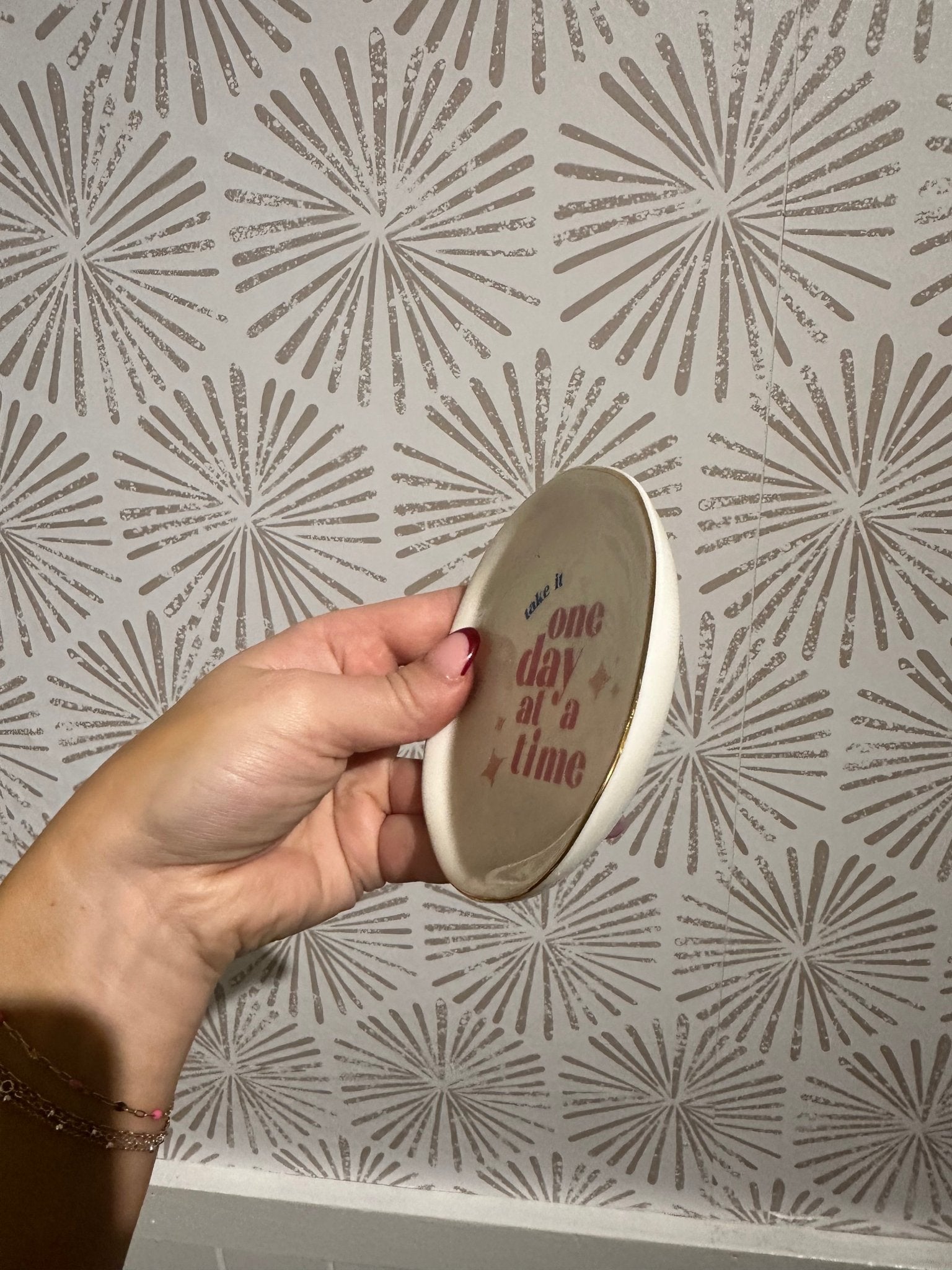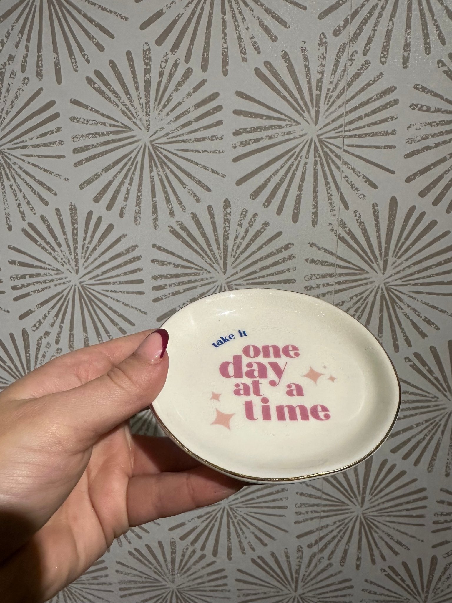 Crafted from smooth white ceramic, this tray features the gentle phrase “Take It One Day At A Time” written in soft pink lettering. The delicate color palette feels soothing and approachable, while the elegant gold edge adds a refined, elevated touch. Together, these details create a piece that is both stylish and serene—perfect for spaces that invite rest, reflection, and balance.