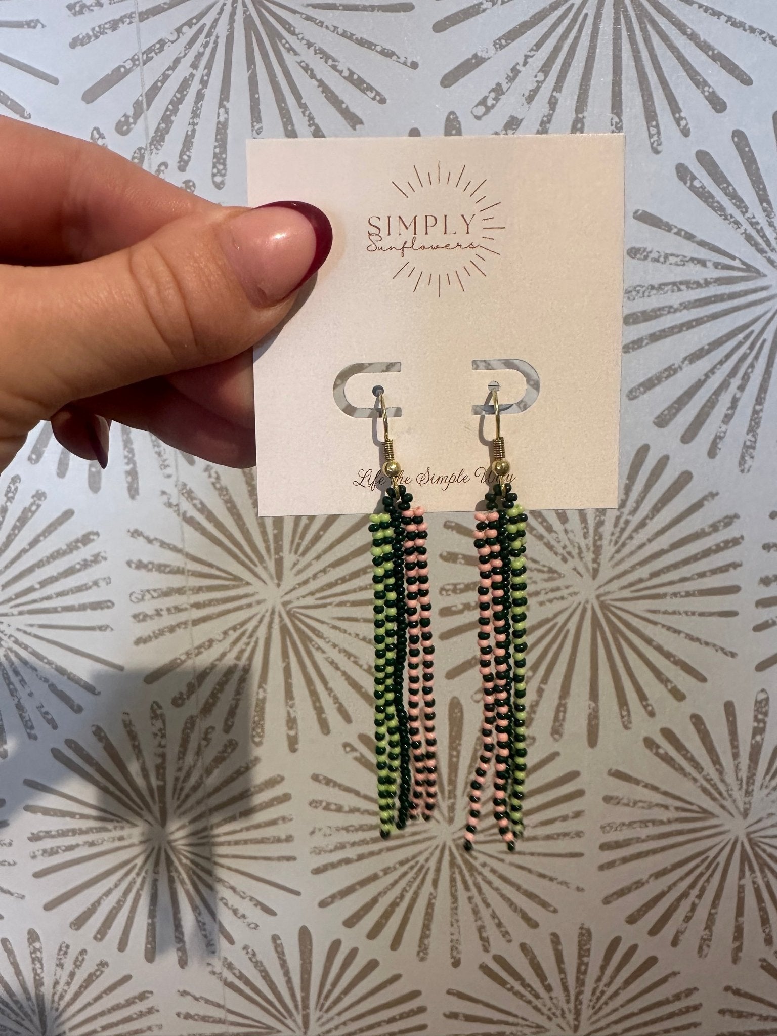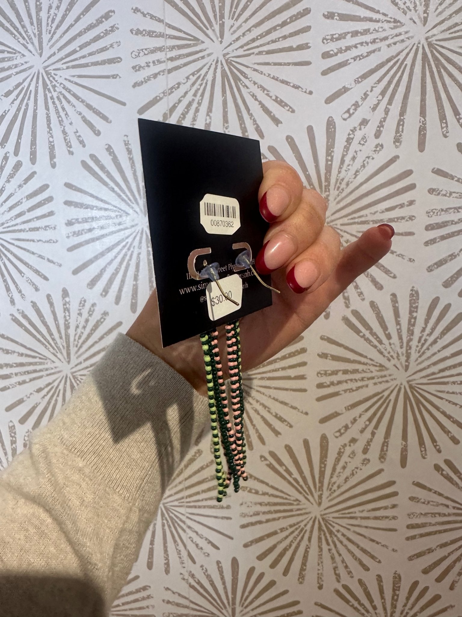 Bold, vibrant, and full of movement, the Melissa Speckled Border Fringe Earrings in Bright Emerald are designed to bring playful color and handcrafted charm to your everyday style. Featuring layers of bright emerald, pink, and vivid green glass seed beads, these earrings create a lively fringe silhouette that catches the light with every step. Their unique speckled border design and artisan craftsmanship make them a standout accessory—perfect for adding personality, texture, and joyful energy to any look.