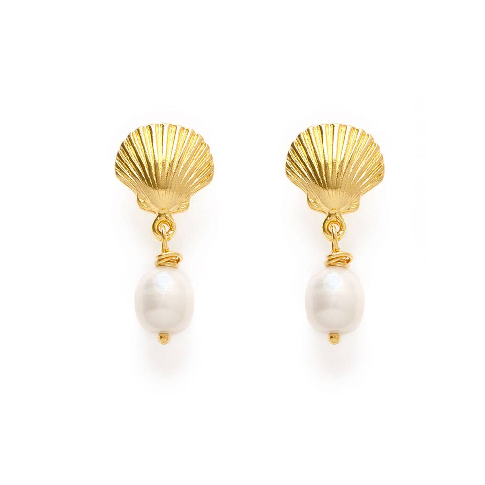 This summer we are celebrating the glorious California coast. We're calling it the Pacifica Collection. Shells are trendy! Pearls are trendy! Made of 14k gold plated brass, lead and nickel free with genuine freshwater pearls. They measure 1" in length.