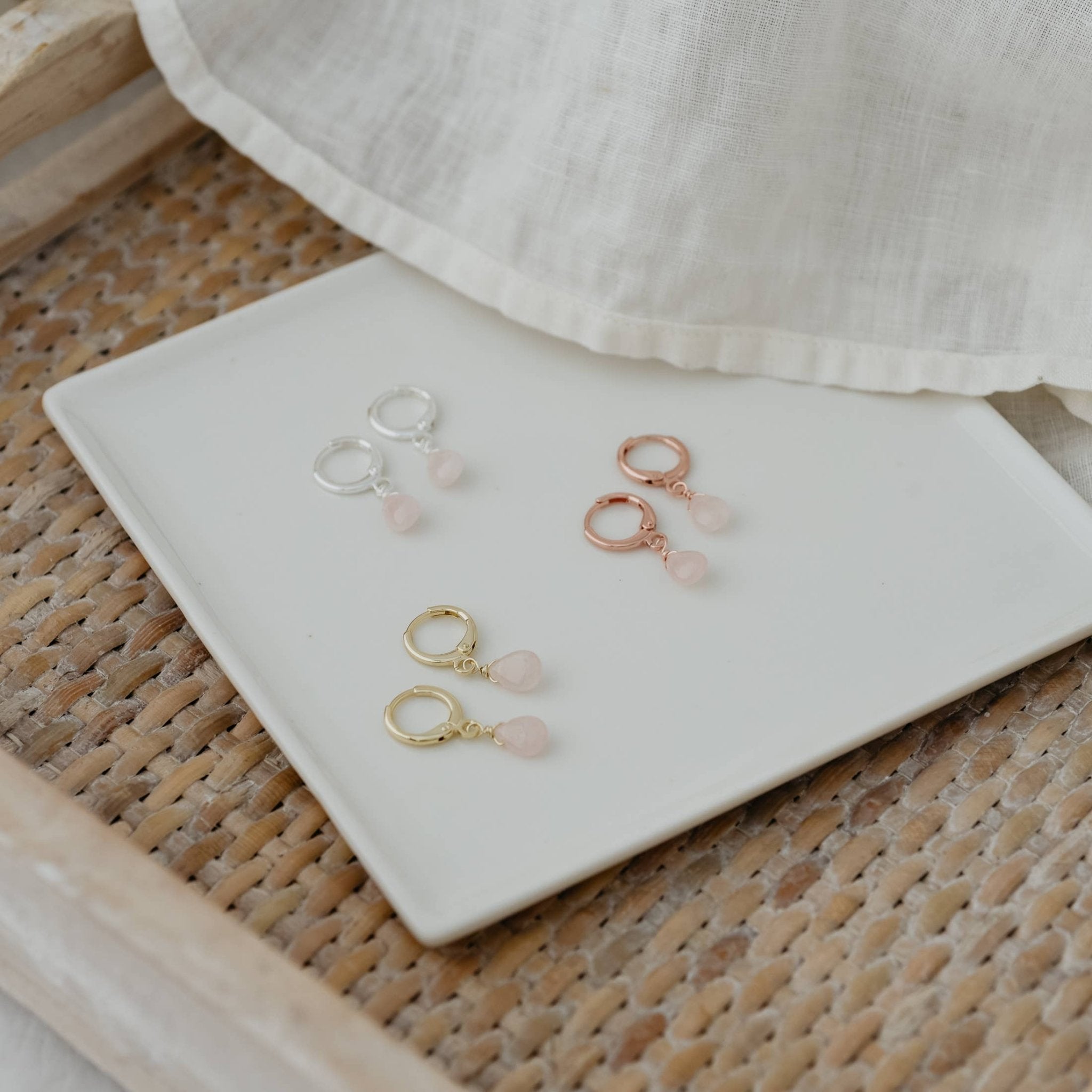 A little drop of beauty. Details: - approx. 1" long from the top of hoop - made with natural rose quartz - gold plated - hypoallergenic, nickel/lead free - anti-tarnish coated
