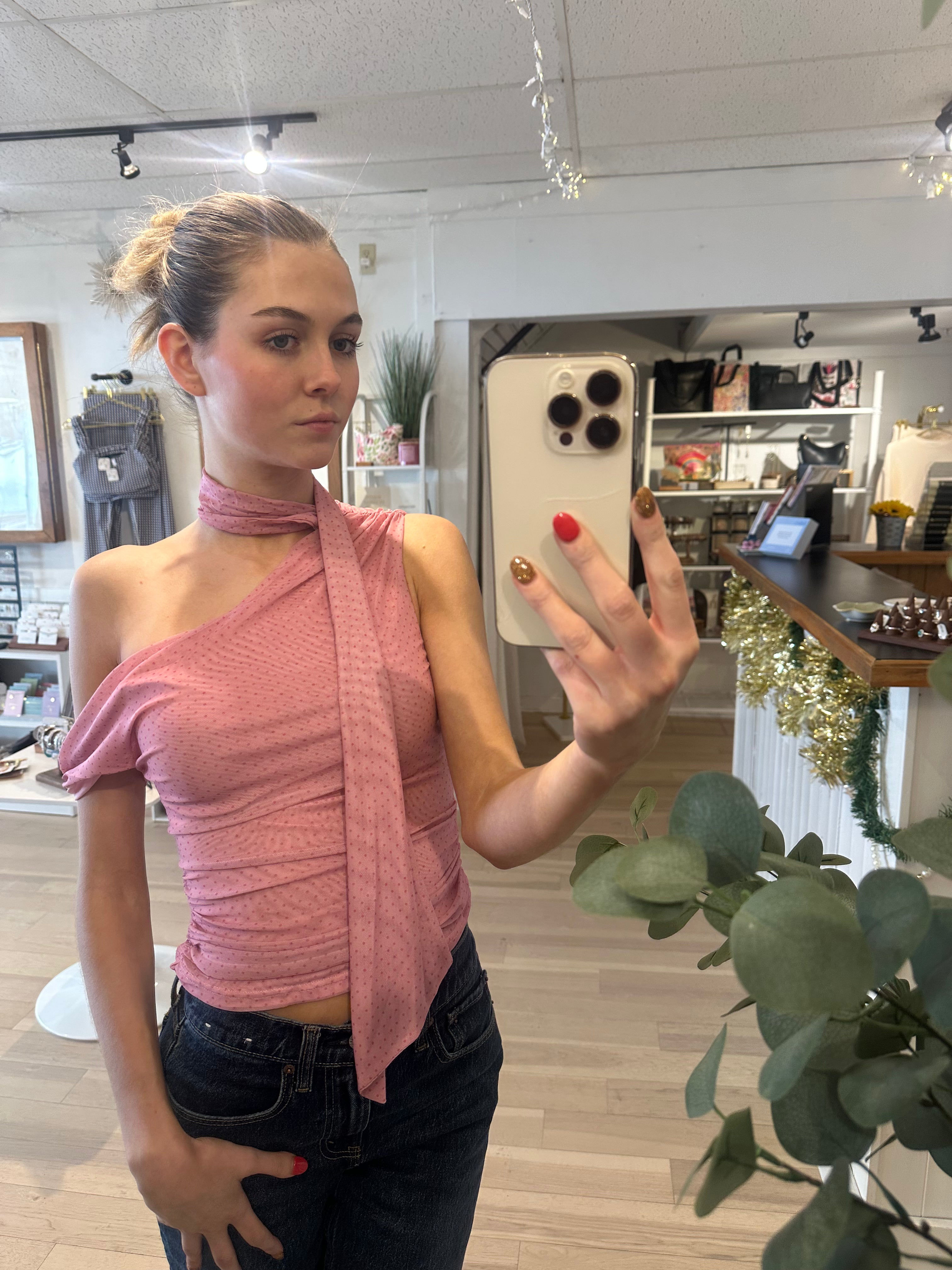 The gentle blush pink color sets the tone with a sweet, flattering look that brightens your outfit without feeling overpowering. It’s a timeless shade that works beautifully year-round and pairs effortlessly with denim, skirts, trousers, and layered looks. Whether you’re dressing for a casual daytime outing or a more elevated evening moment, this top brings a soft, polished vibe to any outfit.