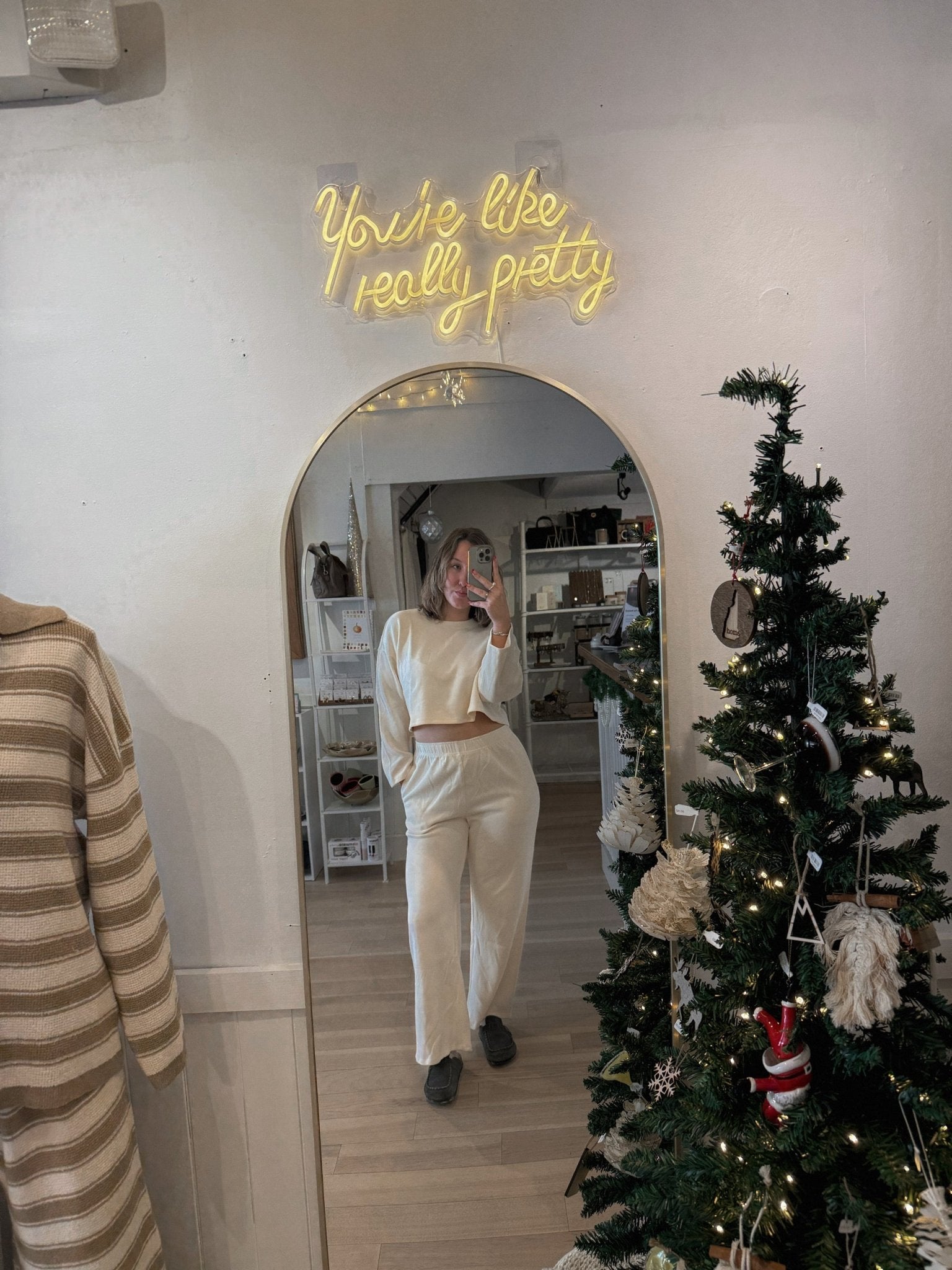 Step into ultimate comfort and effortless style with the Snowy Morning Wide Leg Sweatpants, a pair of cream-colored, wide-leg lounge pants designed to pair perfectly with the matching crew neck for a cozy, coordinated look. Inspired by crisp winter mornings and relaxed holiday vibes, these sweatpants combine plush softness, a relaxed fit, and versatile design to create a wardrobe essential for lounging, running errands, or casual weekend styling.
