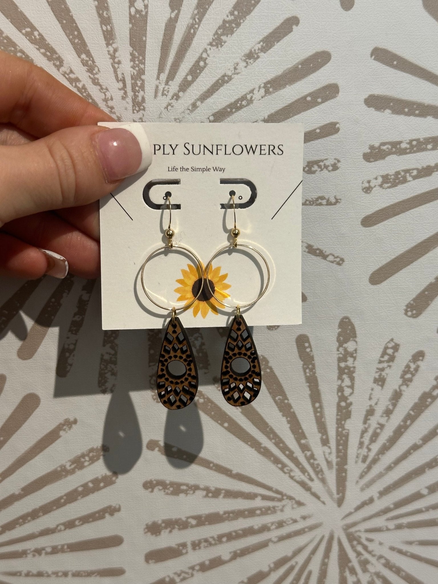 Materials: Laser-cut natural wood with gold-tone hoop accents