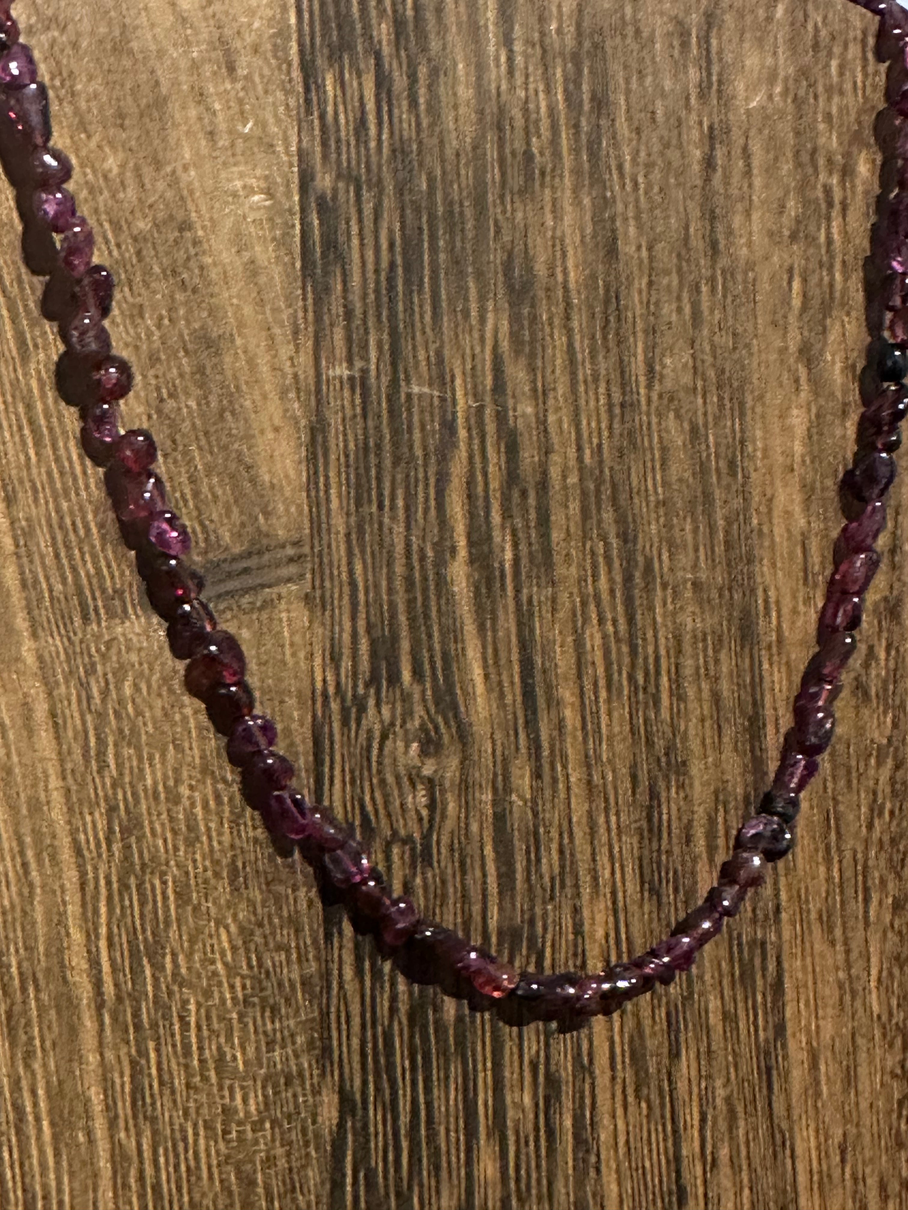 The necklace is perfectly balanced in weight and texture: lightweight enough to wear all day comfortably, yet substantial enough to feel special the moment it’s clasped around your neck. Each garnet bead is polished to a smooth finish and strung with care, giving the strand a soft, fluid drape that lays beautifully against the skin. The subtle variation in natural stone adds character and depth—no two necklaces are exactly alike, making your Ingrid uniquely yours.