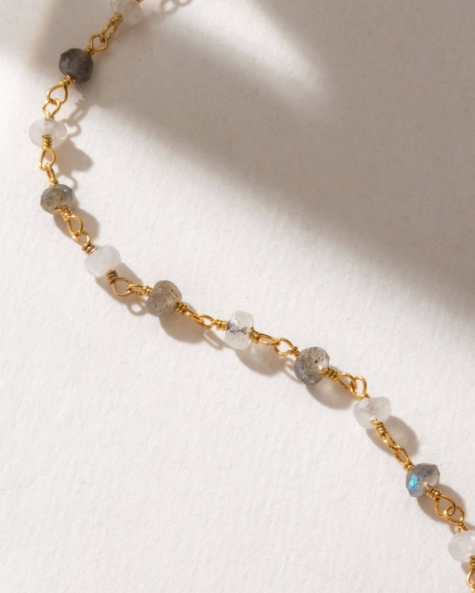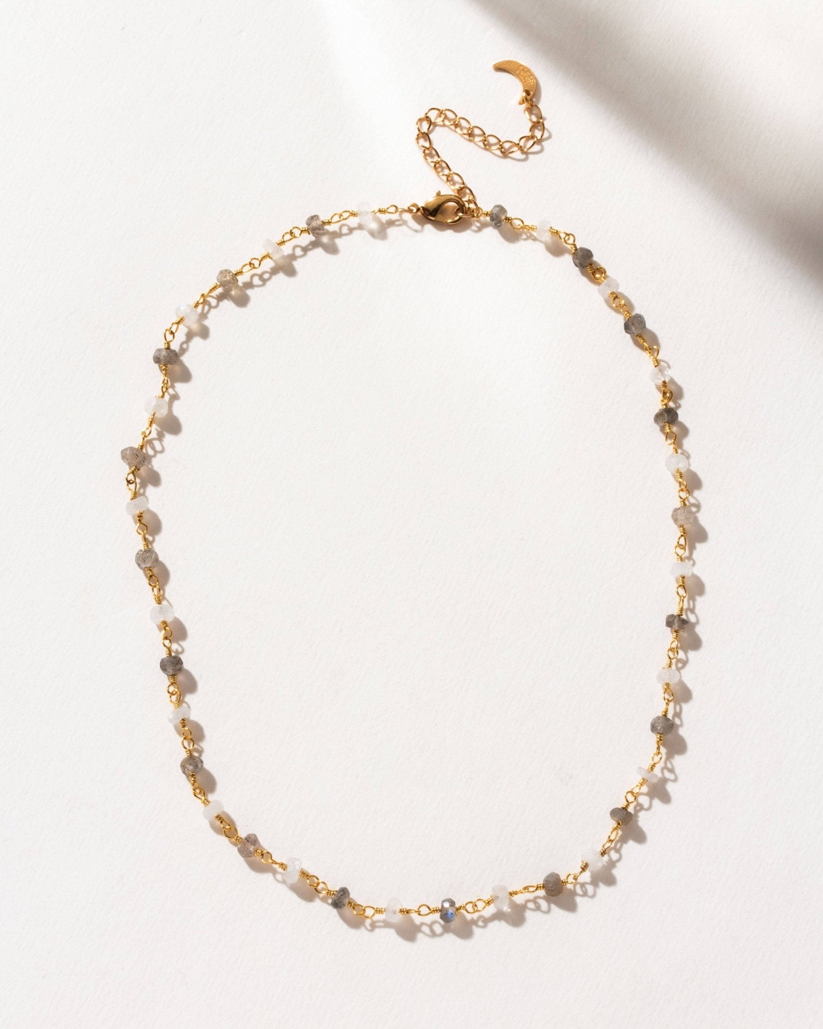 Effortless, luminous, and versatile, this necklace is a must-have for any jewelry wardrobe. Its combination of collar-length design, high-quality materials, and celestial gemstones makes it an ideal accessory for layering or wearing alone. The Labradorite & Moonstone Collar Necklace captures a subtle yet sophisticated glow, offering customers a stylish, dependable piece that enhances every outfit and elevates any collection.