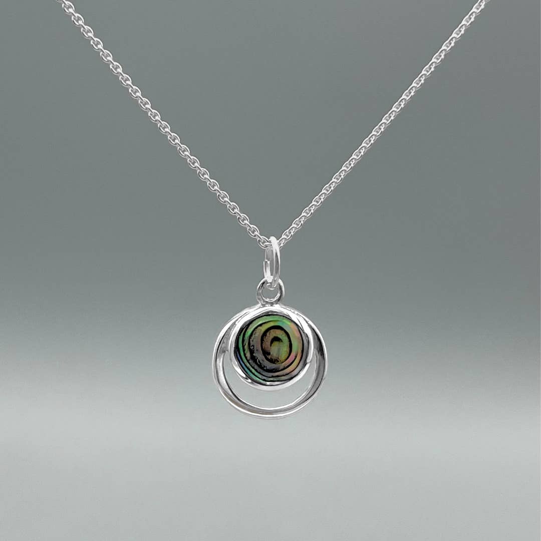 Silver Small Open Circle Bezel-Set Abalone Necklace This abalone open circle necklace is the perfect addition to any outfit. .925 Sterling Silver / Abalone 13mm pendant / 16-18" chain Lobster clasp closure
