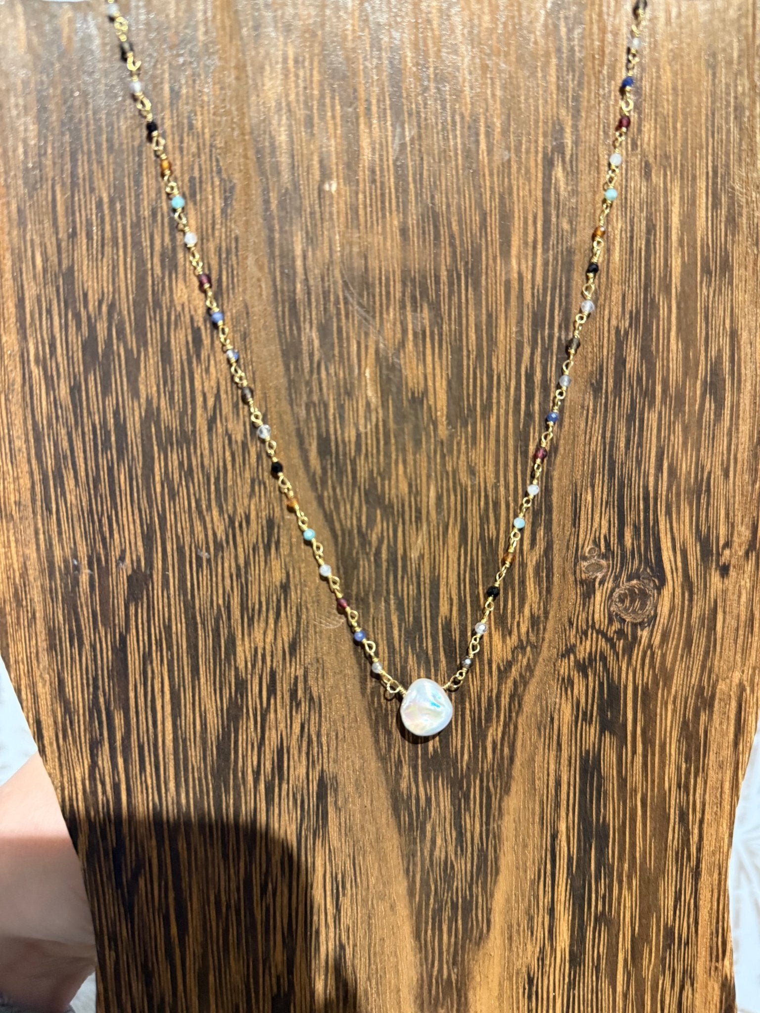 Elevate your jewelry collection with this Pearl & Gemstone Statement Necklace, a piece that blends timeless elegance with a colorful, natural twist. At its center sits a luminous white pearl, gracefully framed by wire-wrapped genuine gemstones in rich, earthy fall-inspired hues. The result is a necklace that feels both classic and modern, offering a versatile accessory that can be worn alone or layered with other favorite chains.