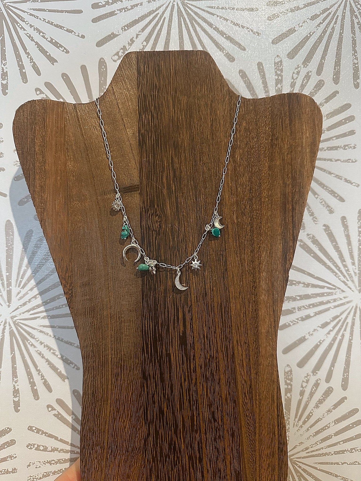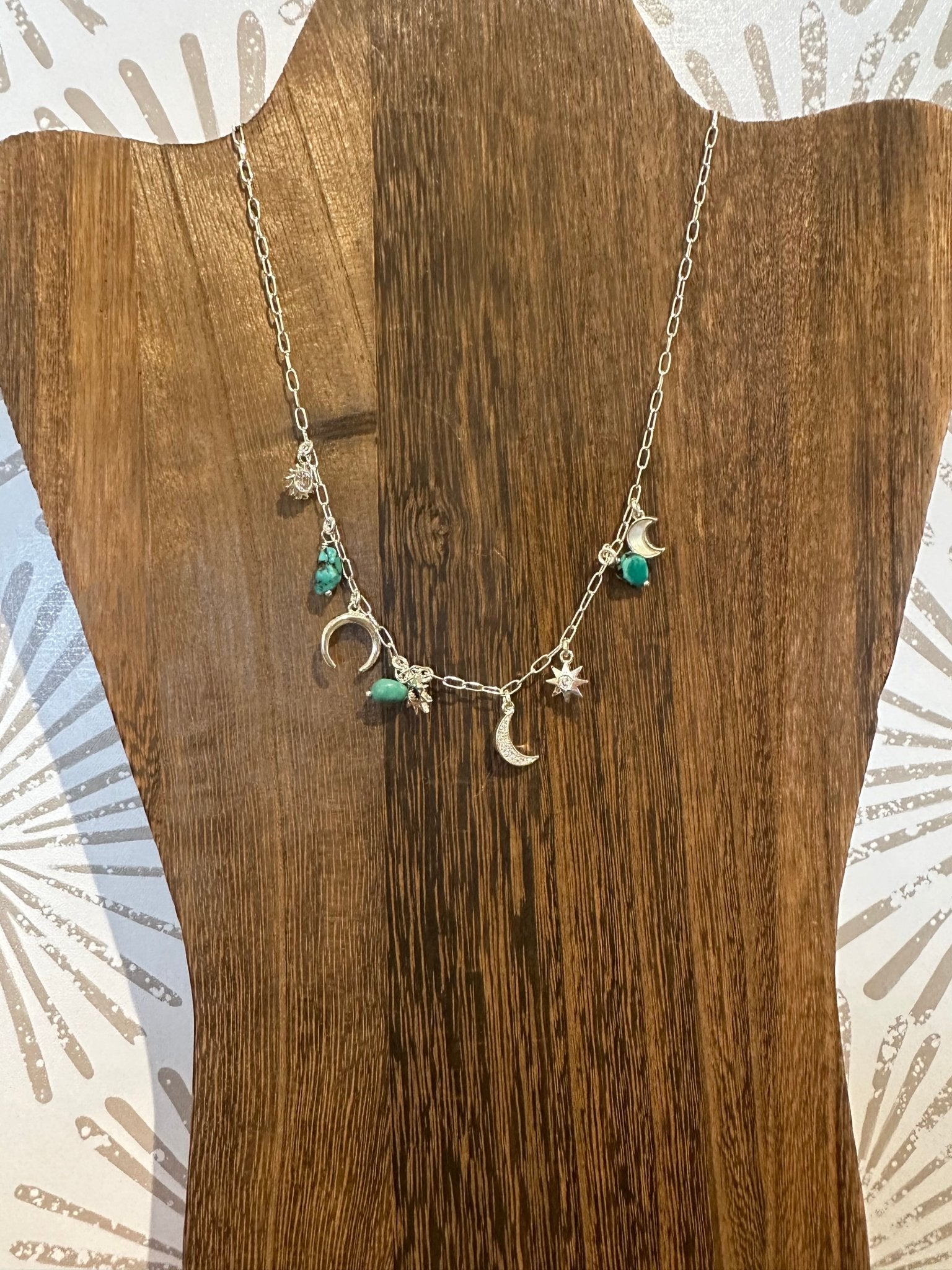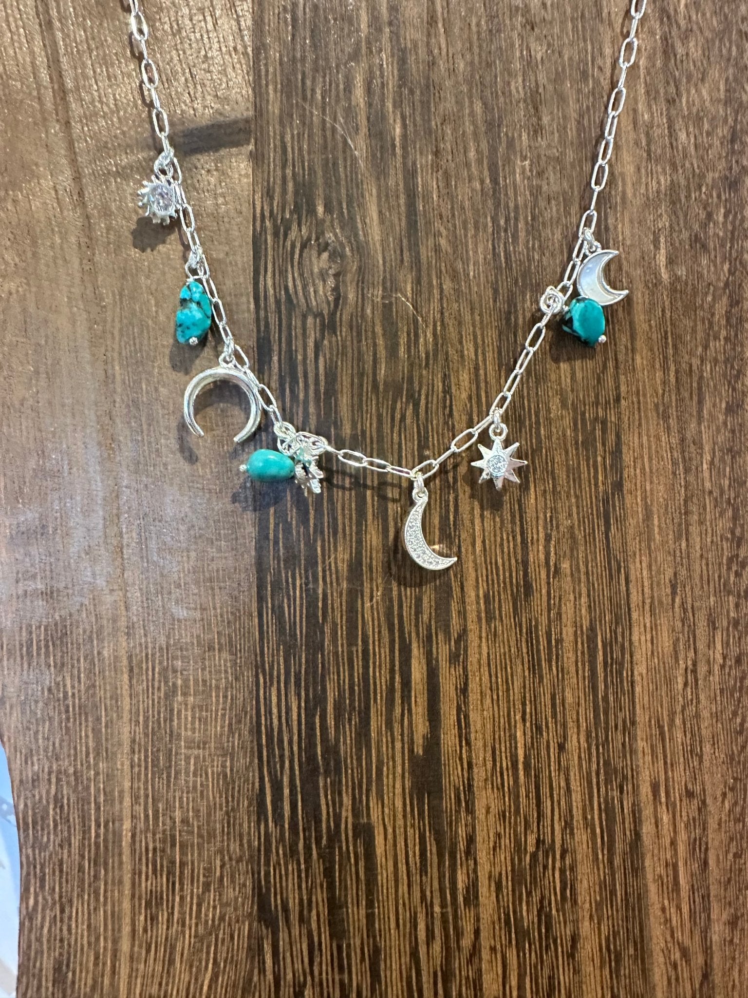 Step into a world where celestial elegance meets desert-inspired charm with the Desert Moon Turquoise Charm Necklace. Designed for women who love jewelry with meaning, vibrant color, and effortless style, this necklace is a harmonious blend of sparkling celestial motifs and grounding natural stones. Whether worn alone for a statement look or layered with other favorite necklaces for a curated bohemian stack, this piece brings a sense of balance, beauty, and individuality to any jewelry collection.