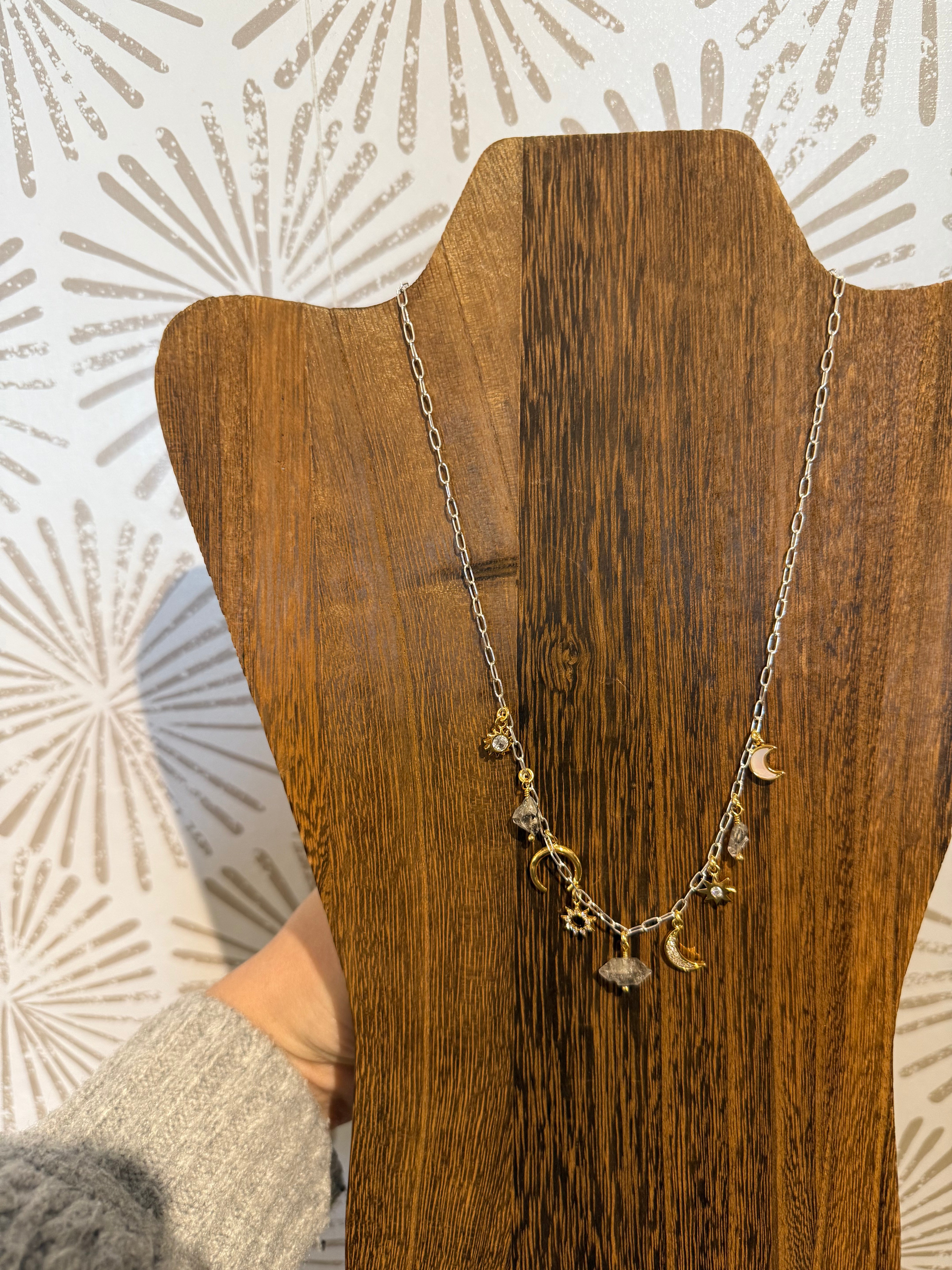 The Horizon Mixed Metal Charm Necklace is ideal for anyone who loves jewelry with meaning and versatility. Its celestial theme, sparkling accents, and organic gemstone make it a thoughtful gift for birthdays, holidays, or personal milestones. Whether gifting it to a loved one or treating yourself, this necklace is designed to be cherished for years, becoming a signature piece that reflects individuality and style.