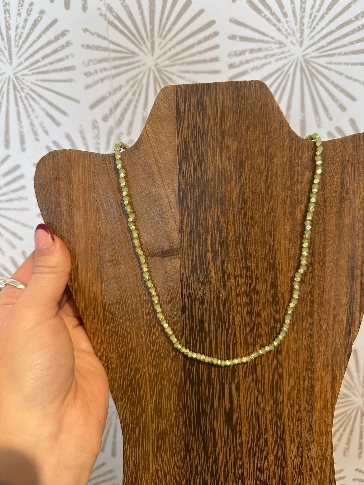 The design features soft mint crystal beads interspersed with faceted lacquered brass beads, creating a refined contrast that catches the light beautifully. The mix of cool, fresh mint tones with the warm metallic brass adds depth and texture, making the necklace perfect for layering with other pieces or wearing solo as a subtle statement. Its clean, classic look complements casual denim, neutral outfits, and even more polished ensembles, making it a go-to accessory for day-to-day wear.
