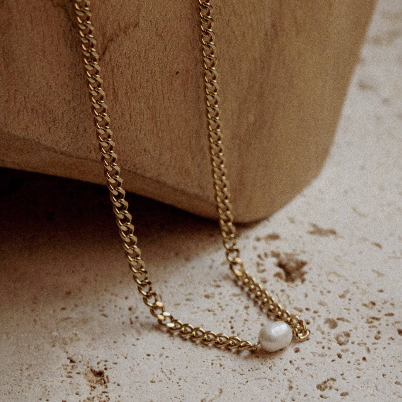 This Chunky Curb Chain Necklace blends boldness with timeless style, highlighted by a beautiful baroque-style imitation pearl. Its wide, flat links offer a subtle edge, balanced by the pearl’s vintage charm. Ideal for layering or wearing alone, it easily shifts from casual to chic. Pair it with a classic white tee or a sophisticated dress to instantly elevate your look. * 18k gold plated * Stainless steel * Tarnish resistant + water proof * 14.5" length * 2" extender chain * Lobster clasp closure