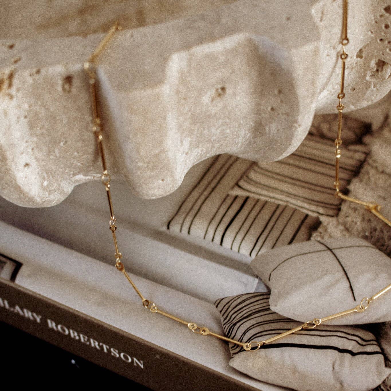 Simple, sleek, and just a little different—this gold necklace features a unique chain made of tiny straight bars linked together. It catches the light beautifully and adds a modern touch to any look. Wear it solo for a minimal vibe or layer it with your favorite pieces. Available in silver and gold.