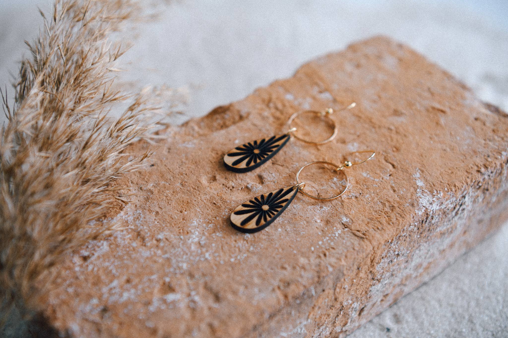 Materials: Laser-cut natural wood with gold-tone hoop accents
