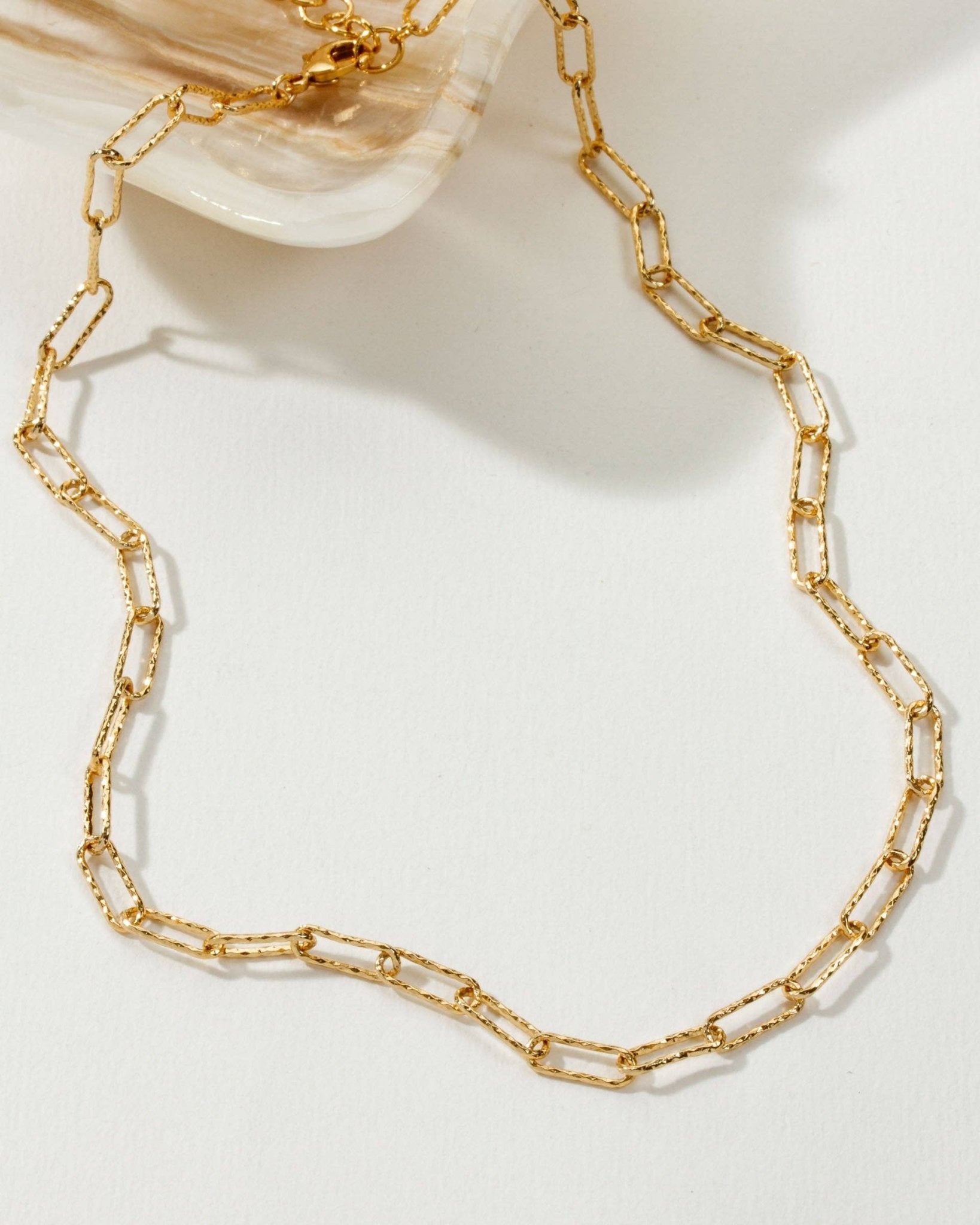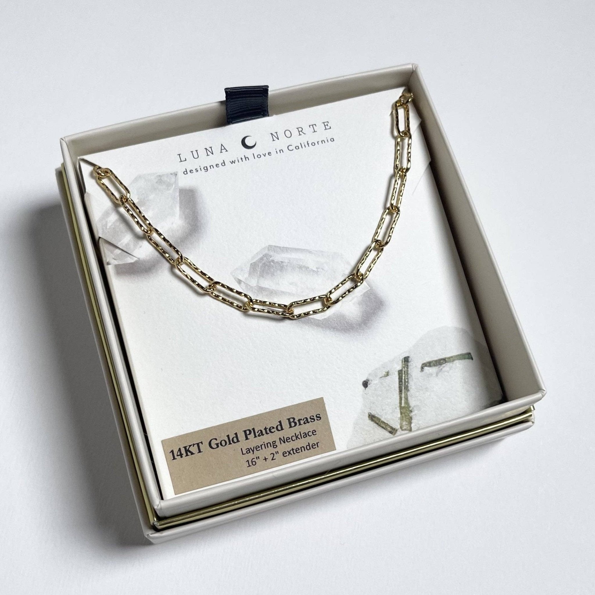 Its 16-inch length with a 2-inch extender allows for versatile styling, perfect for layering with other necklaces or wearing solo as a refined statement. The gold-plated brass finish provides a luxurious shine while maintaining durability, ensuring this chain withstands daily wear and remains a polished addition to any jewelry collection.