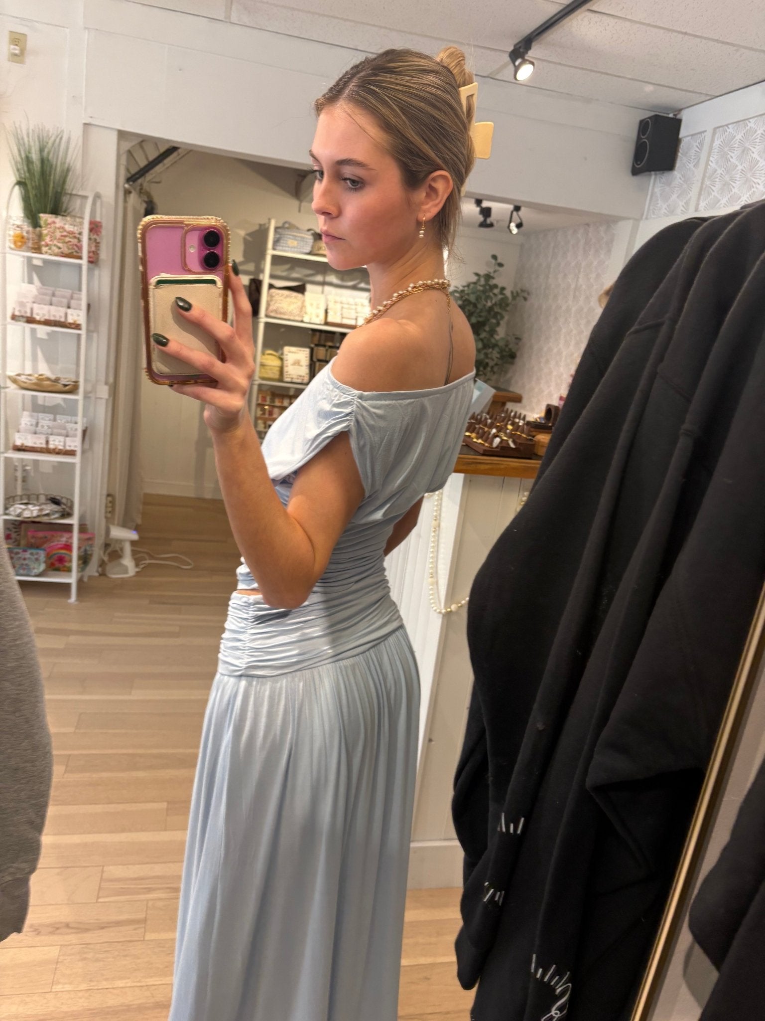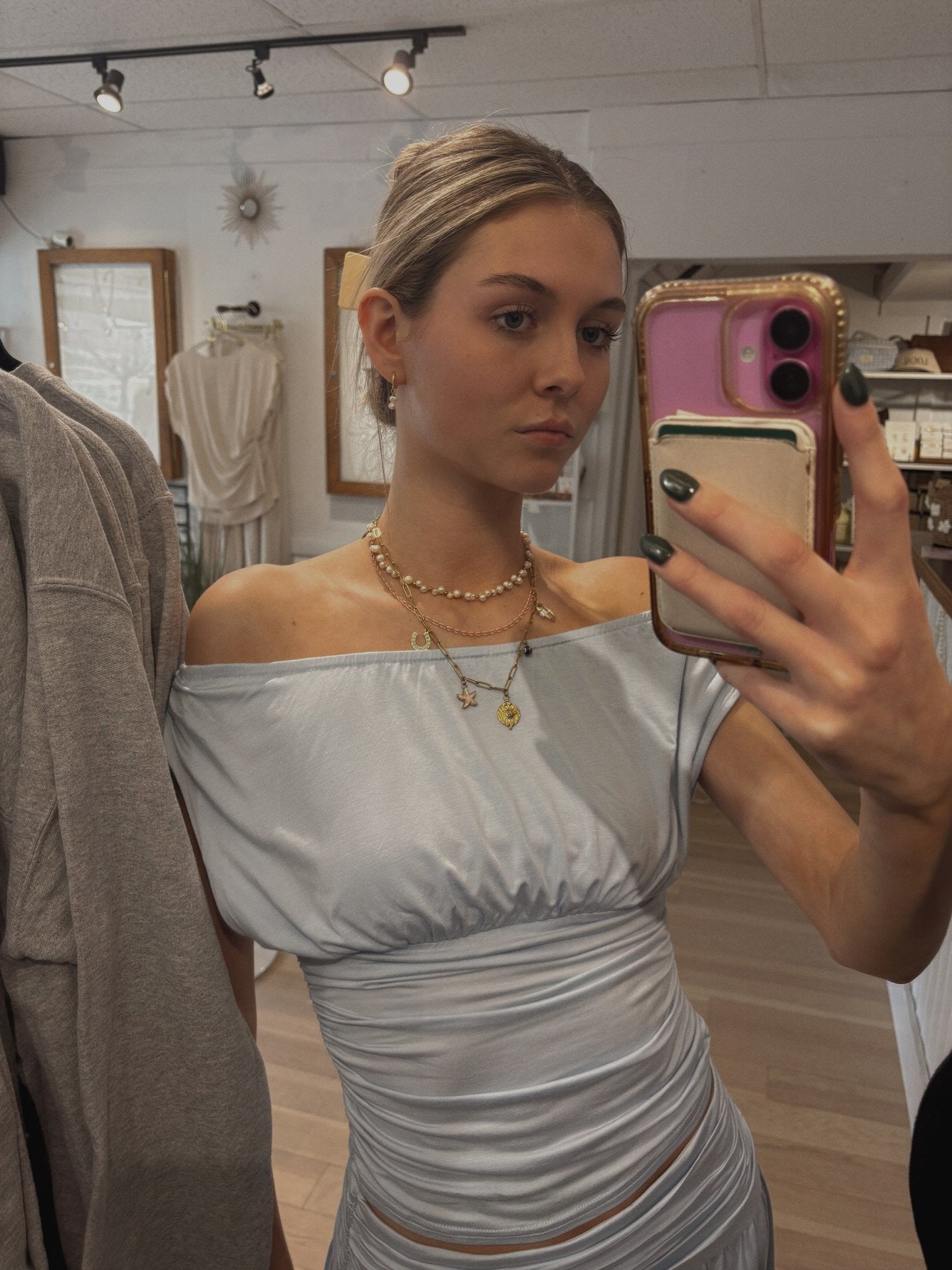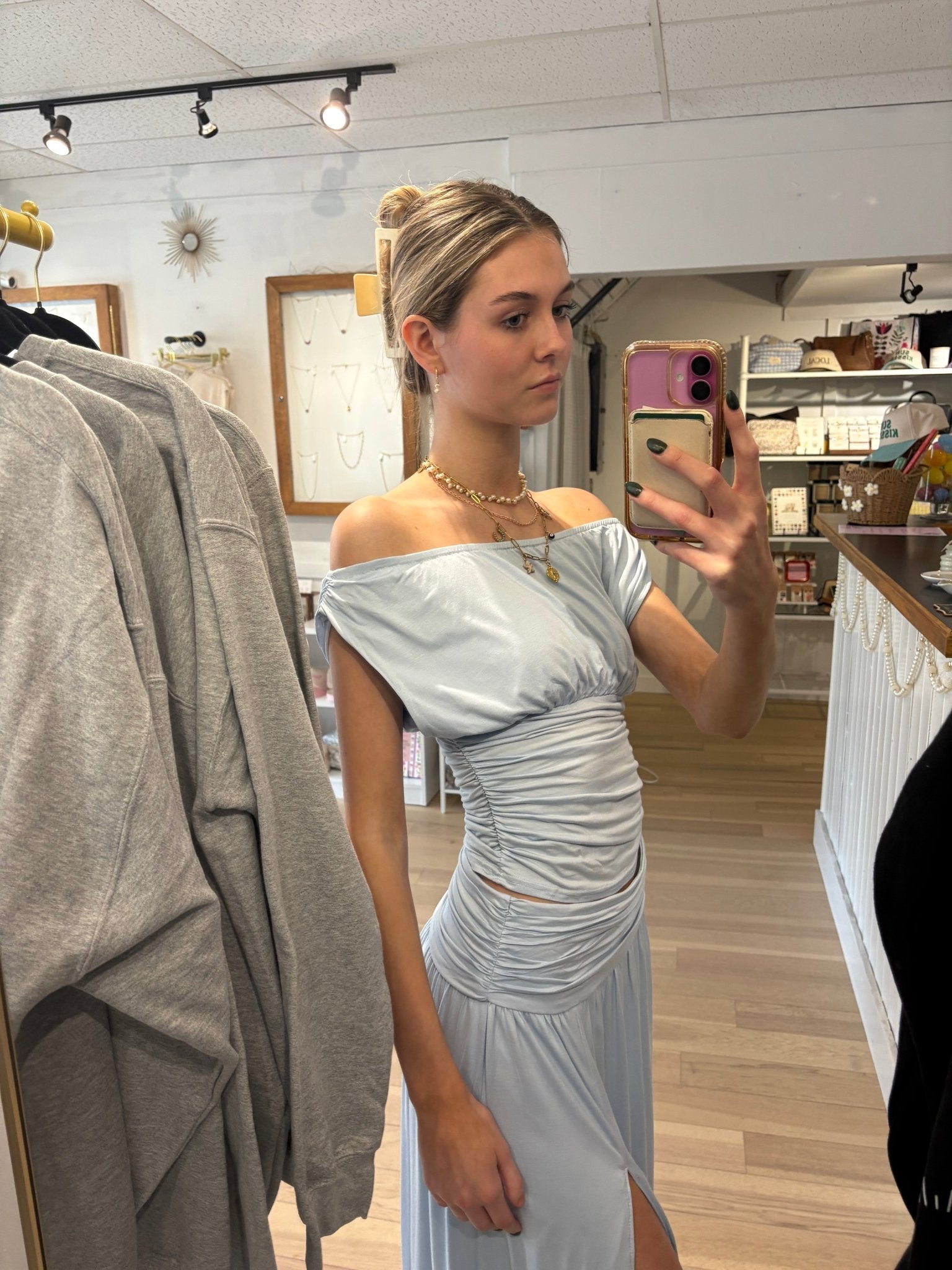 Feminine, flattering, and effortlessly chic, the Nantucket Ruched Top is designed to add a soft, romantic touch to your everyday style. Featuring a graceful off-the-shoulder neckline and delicate ruching at the waist, this top creates a beautifully shaped silhouette while remaining comfortable and easy to wear. The fitted, cropped design pairs perfectly with the Nantucket Ruched Maxi Skirt for a coordinated set, or can be styled with your favorite denim or trousers for a polished yet relaxed look.