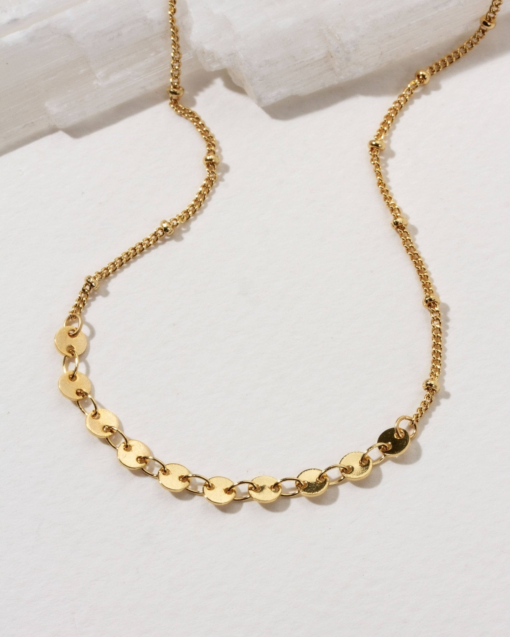 The Goddess Coin Chain Necklace draws inspiration from the beauty and symbolism of ancient coin jewelry. Each coin station reflects light like a talisman, creating a soft shimmer that captures attention while remaining elegant and understated. The design evokes a sense of grounded power, making it perfect for wearers who appreciate jewelry with both aesthetic appeal and symbolic significance.