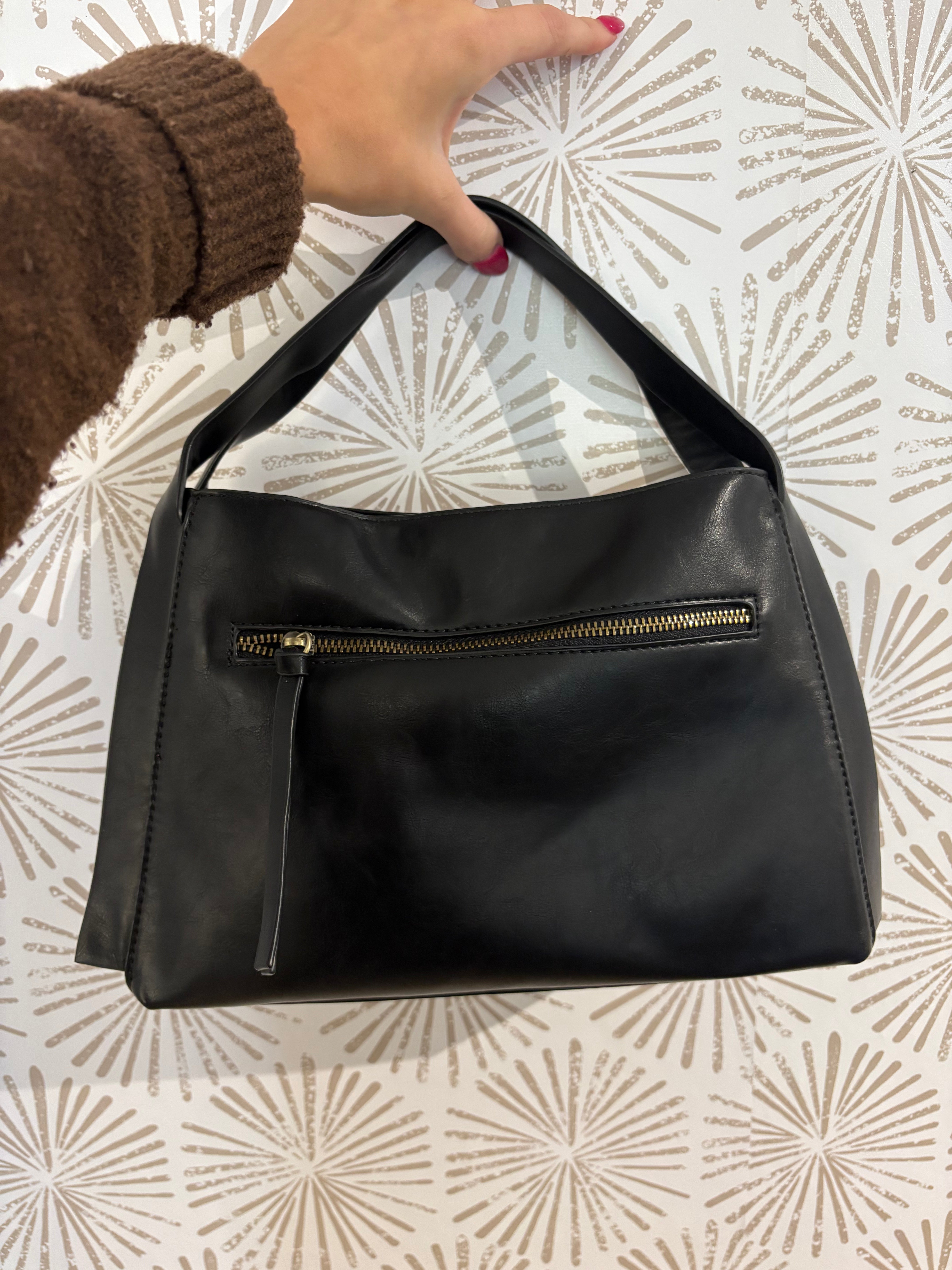 Dimensions: 8 in. H X 11.5 in. W X 4 in. DThree interior compartments: one center zip, two magnetic snap closuresTop handles: 4 in. dropAdjustable and removable shoulder strap: 13 - 24.5 in. dropBrass plated hardware100% Vegan leather (polyurethane)Matching color microfiber liningExterior back zip pocketOne interior zip closure pocketTwo interior open pockets