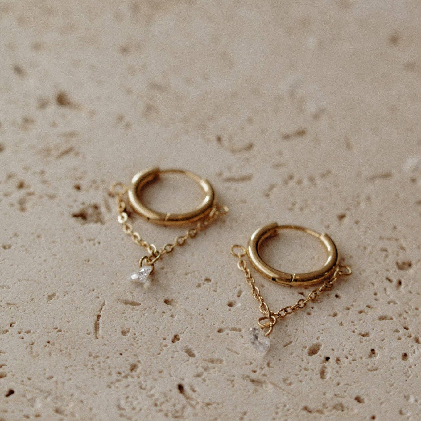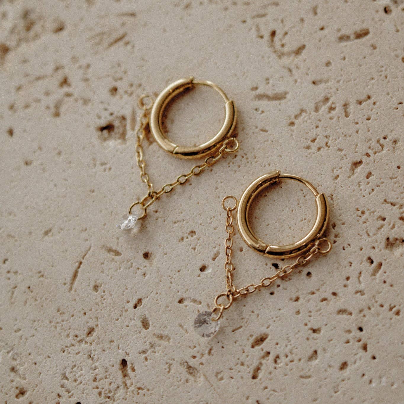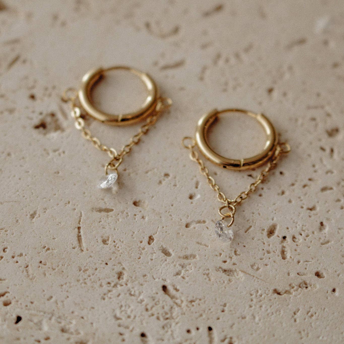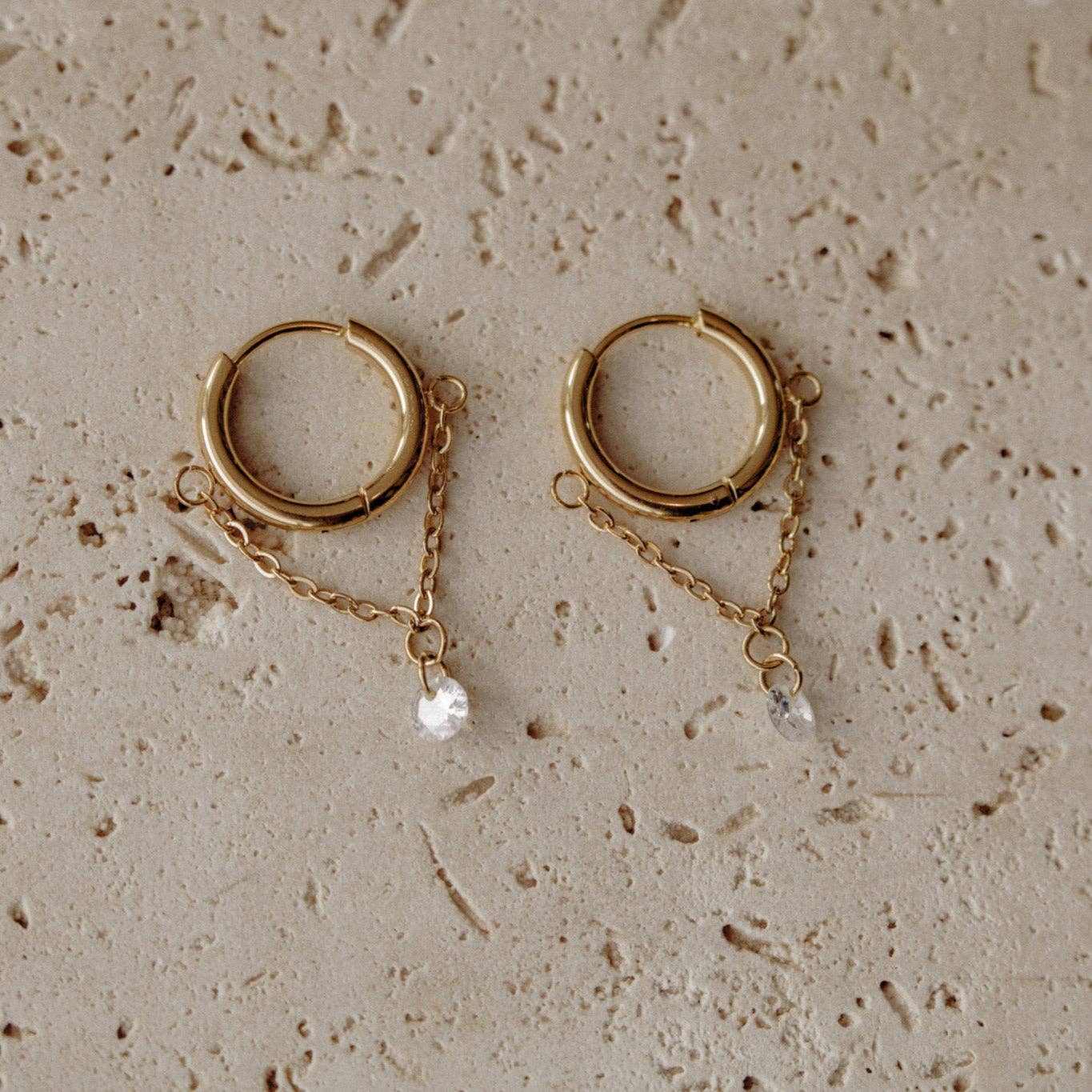 A classic hoop featuring a bohemian style drop chain and crystal bead. * 18k gold plated * Stainless steel * Tarnish resistant + water proof * Pushback style closure * Hoop approximately 1/2"