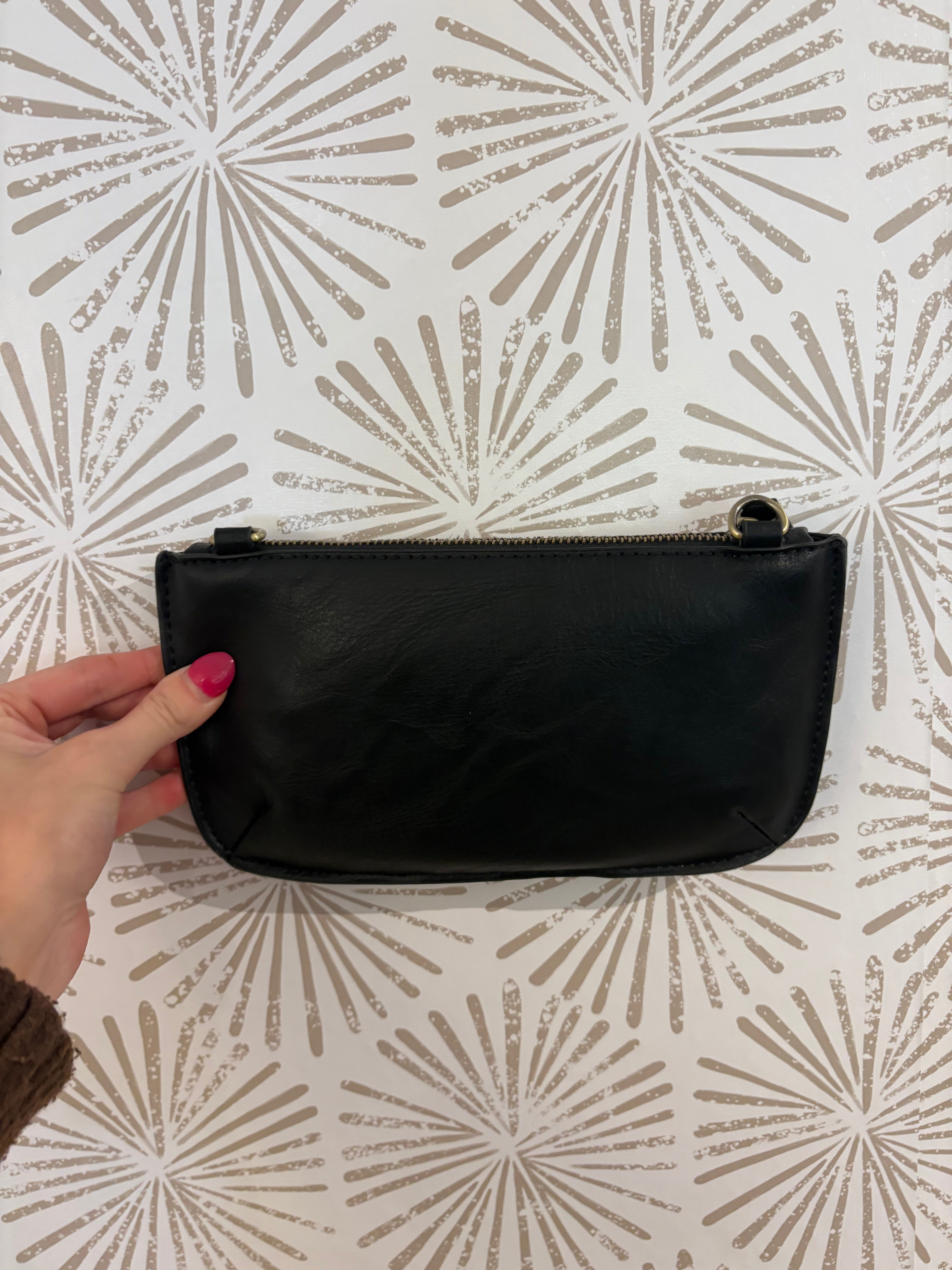 Dimensions: 5 in. H x 9.5 in. W x 1 in. D7 in. Detachable wristlet strapAdjustable and detachable crossbody strap: 8 in. - 21 in. dropInterior zippered pocketSix interior card slotsFabric liningBrass plated hardware100% Vegan leather, woven (polyurethane)