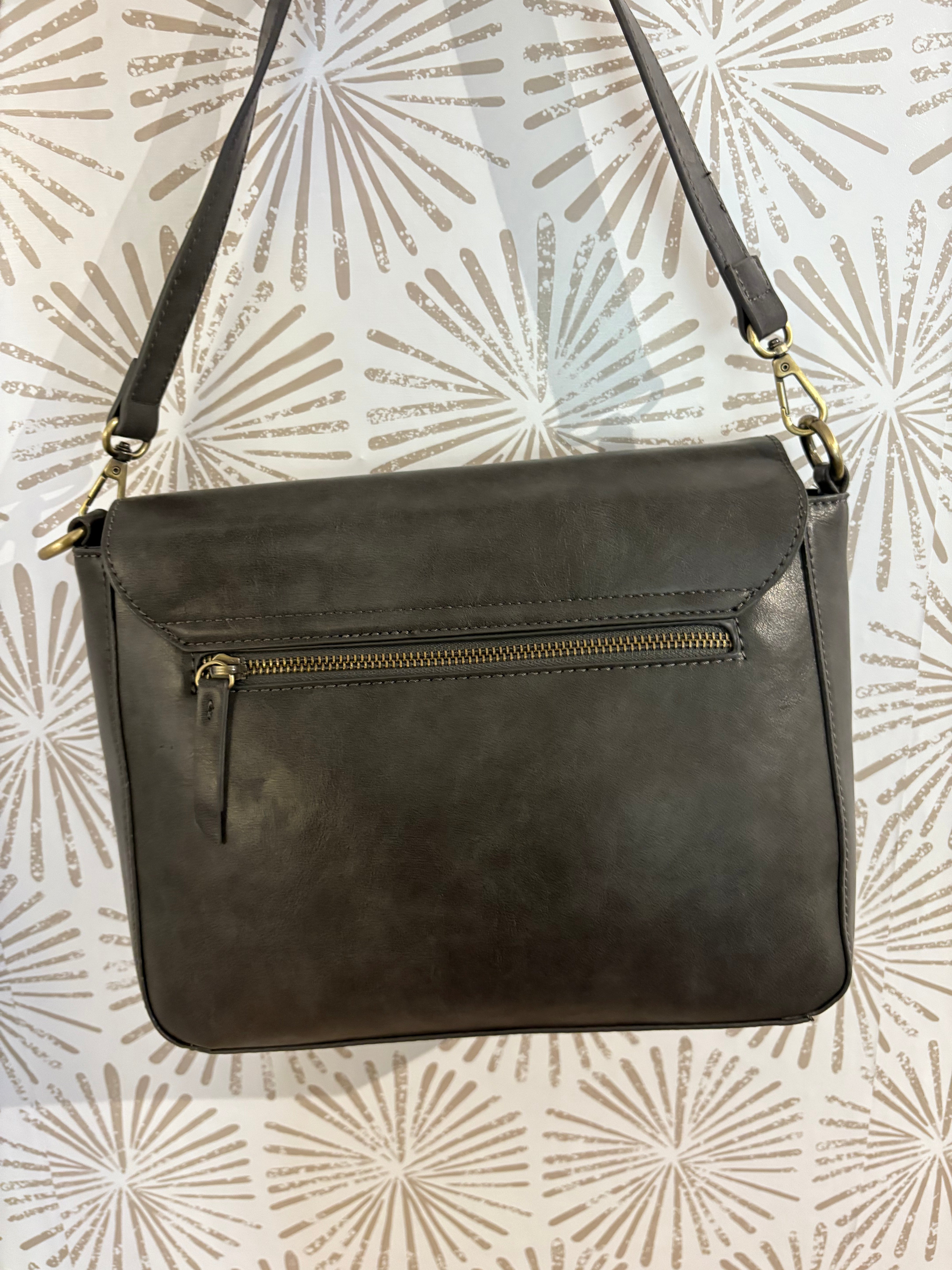 Dimensions: 10.25 in. W x 8.5 in. H x 3.5 in. DMagnetic Snap ClosureExterior Front PocketExterior Back Zipper PocketInterior Zip Closure Pocket11 in. Drop Short Shoulder Strap2123 in. Detachable Adjustable Cross Body StrapBoho Print LiningBrass plated Hardware100% Vegan leather (polyurethane)