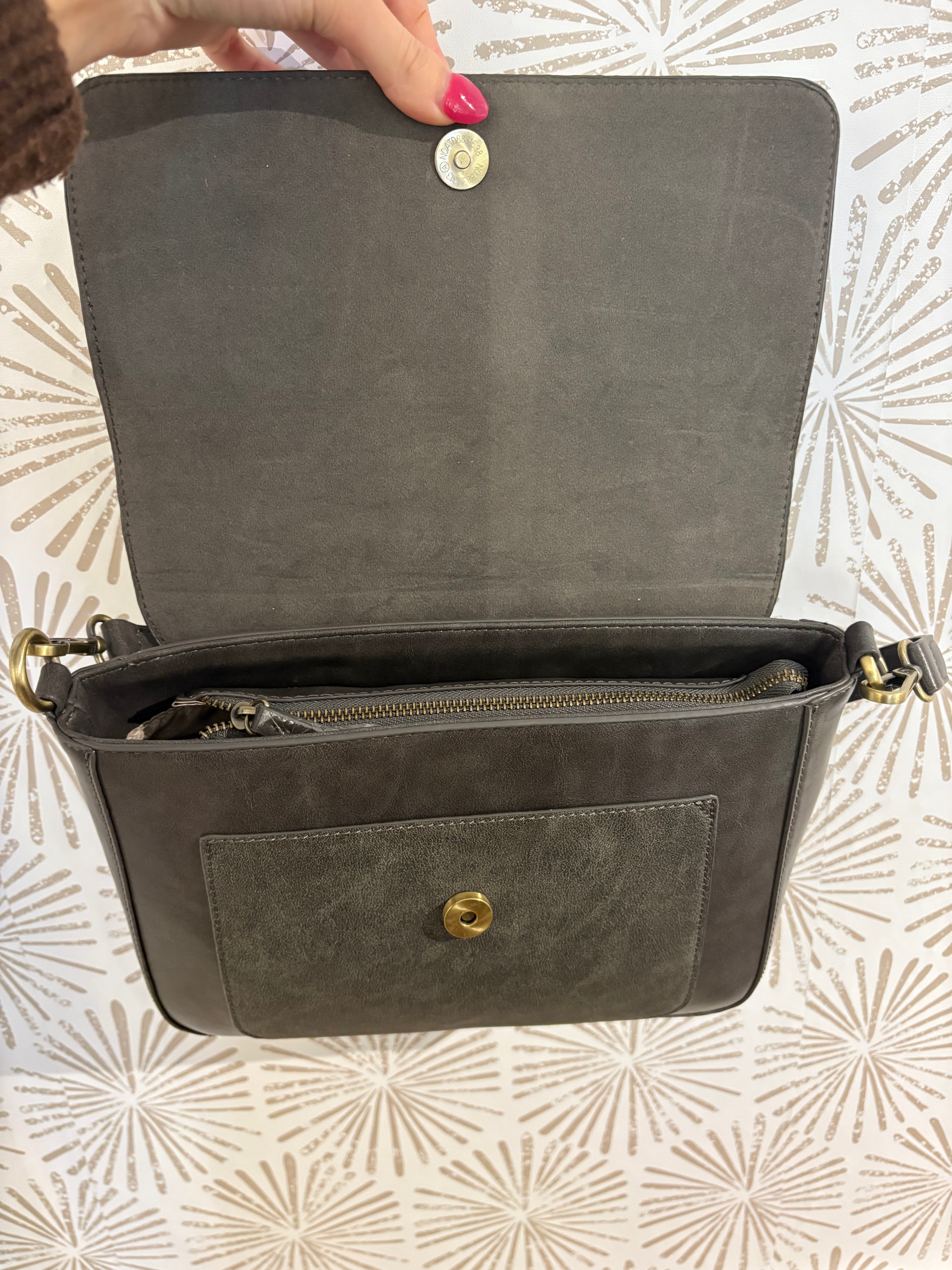 Carry as a shoulder bag or wear as Crossbody, the choice is yours with this versatile bag that can be dressed up or down. Made in luxurious vegan leather accented with soft vegan faux suede in colors perfect for year-round wear. Add one of our embroidered or faux fur guitar straps to make this bag your own and express your own unique style!Product Details