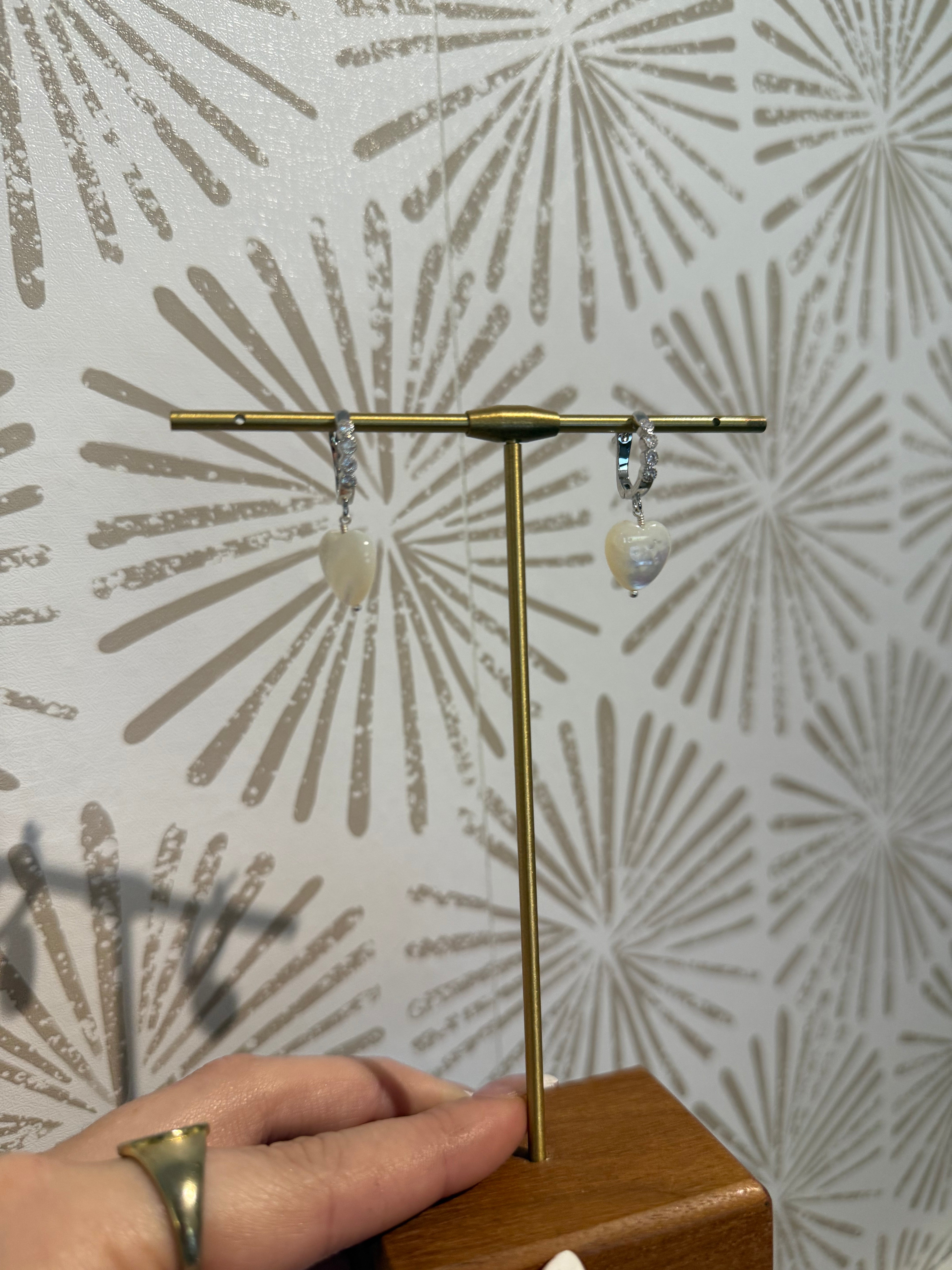 Each pair features genuine mother-of-pearl hearts—naturally iridescent, softly reflective, and beautifully unique. Mother-of-pearl is cherished for its calming glow and organic texture, and in this design it brings a touch of subtle luxury. No two hearts are exactly the same, giving each set of Luna Kiss Hoops its own one-of-a-kind qualities. The hearts catch the light gently as they sway, adding a luminous finish that plays beautifully with the silver-plated hoops.