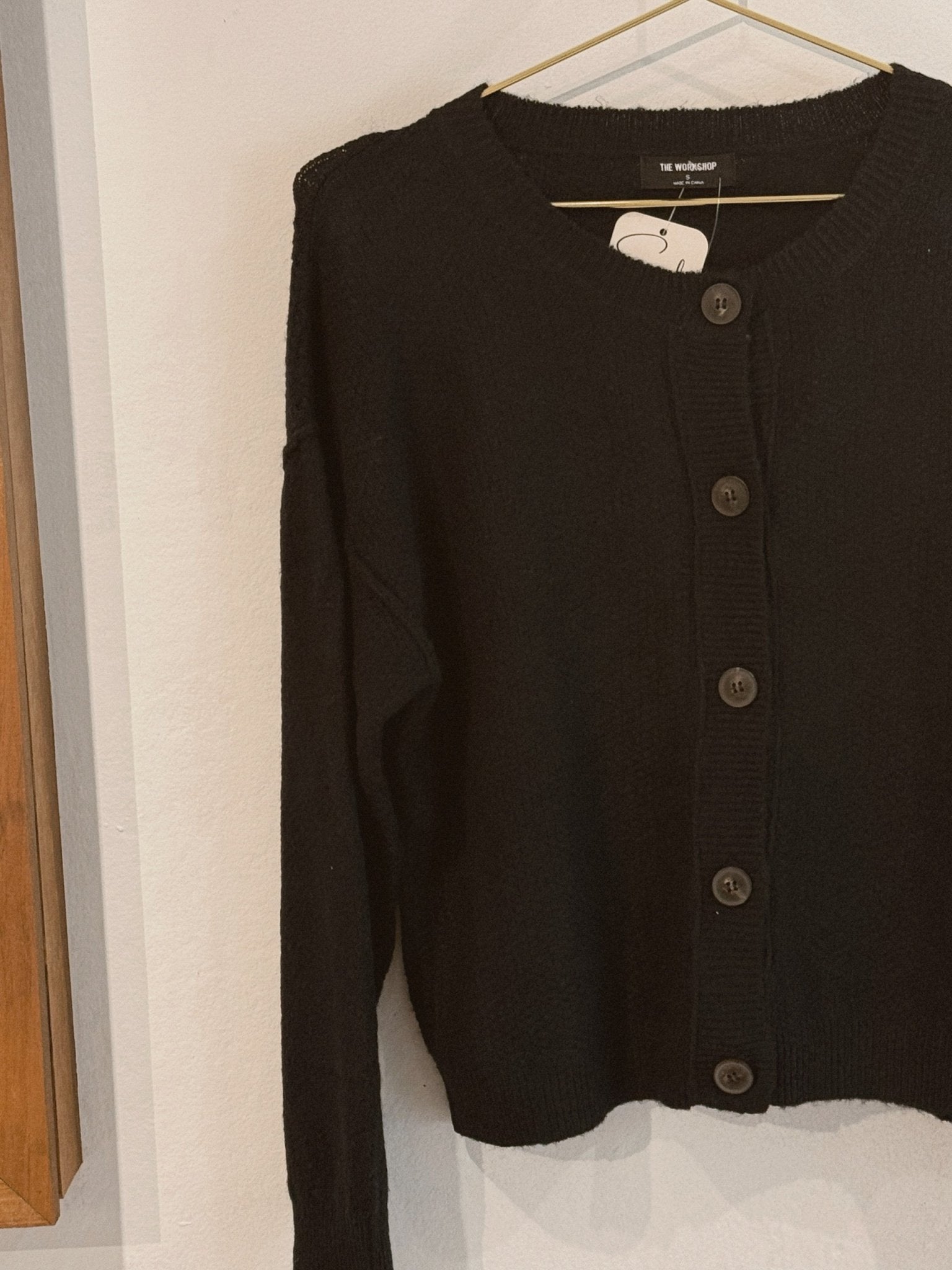 Round neckline Long sleeves Drop shoulder Ribbed trim detail Relaxed fit Solid Not lined Knit sweater Cardigan Wool blend 65%recycled polyester 13%acrylic 13%nylon 6%wool 3%spandex
