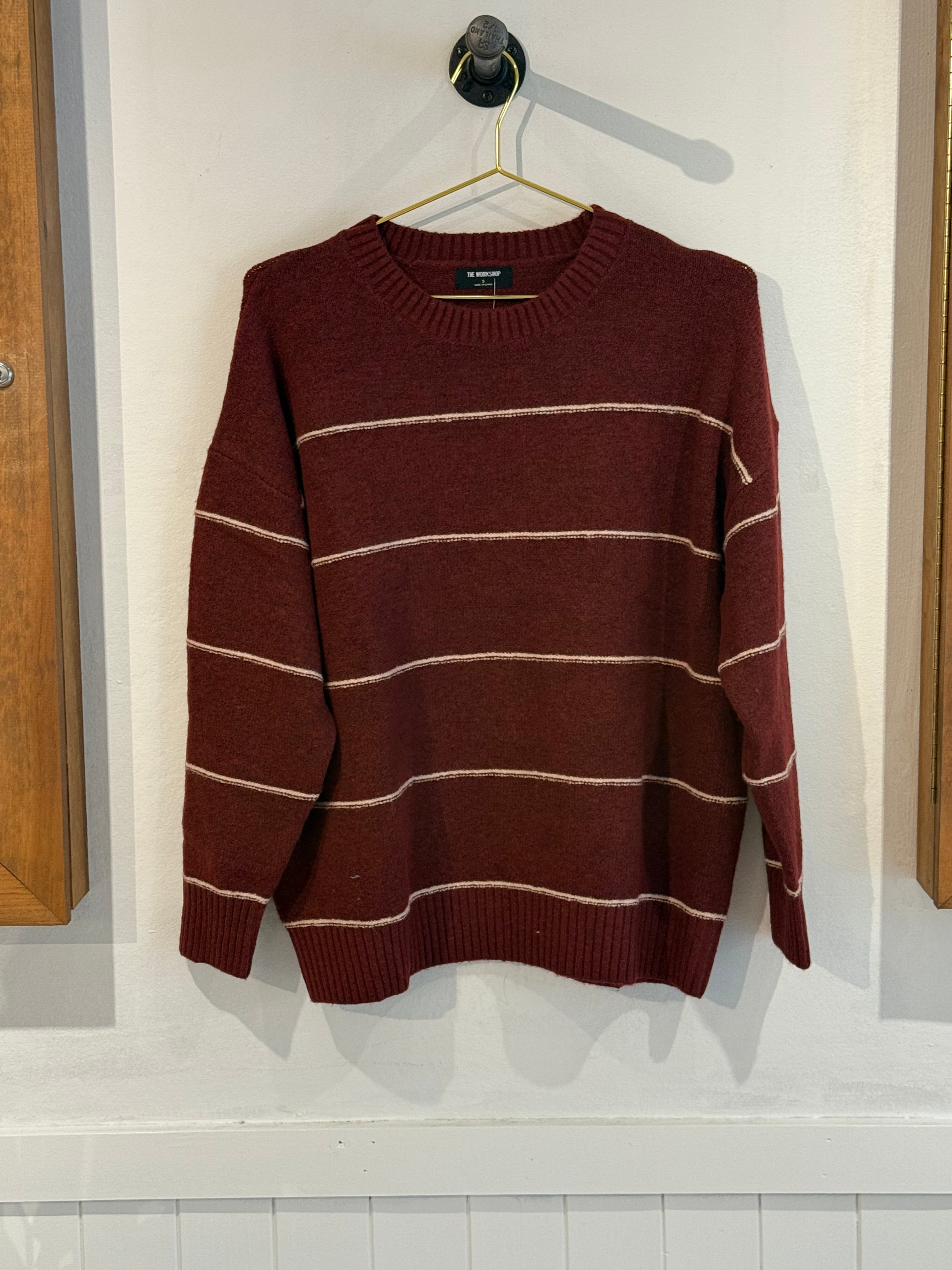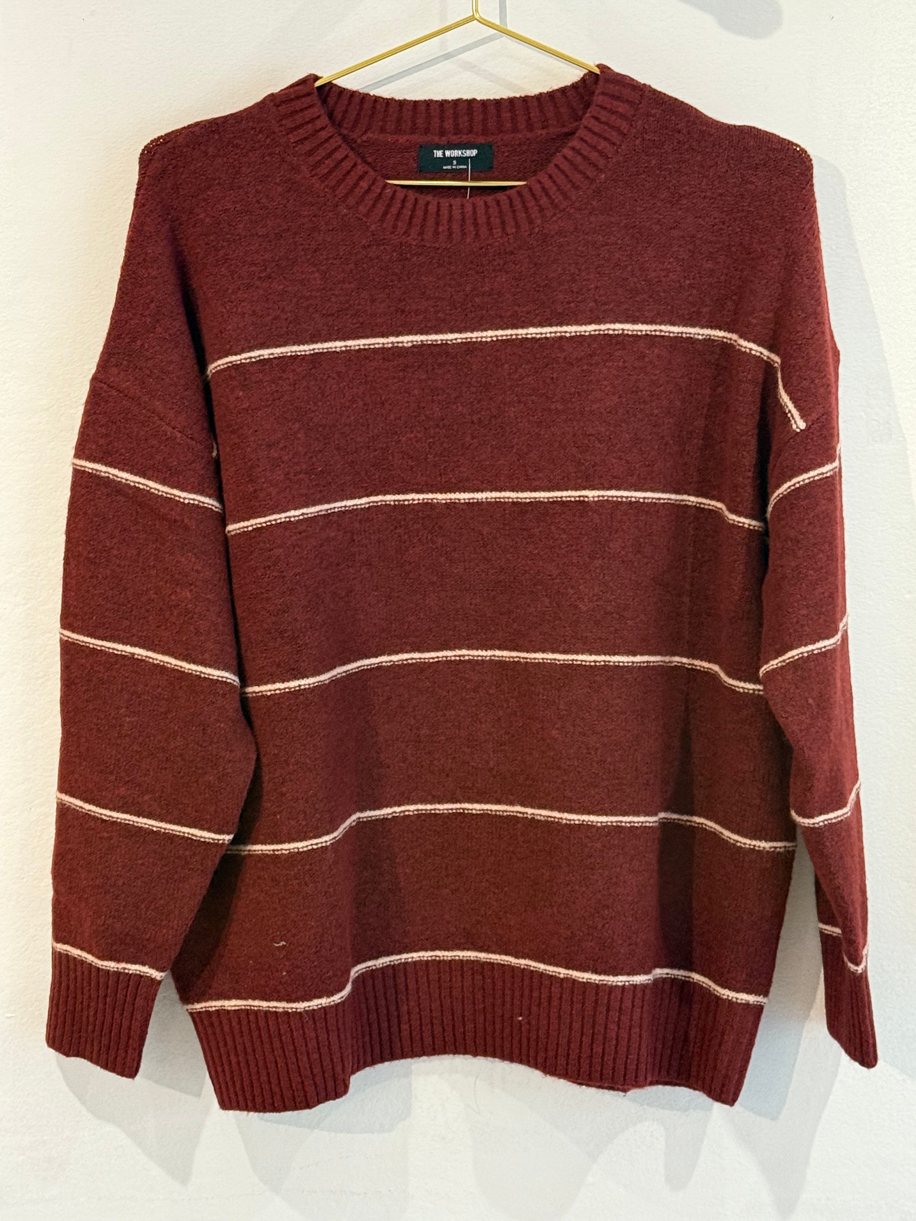 Round neck Crew neck Long sleeves Drop shoulder Oversize fit Stripe pattern Not lined Knit pullover sweater 45%polyester 33%recycled polyester 13%acrylic 6%wool 3%spandex