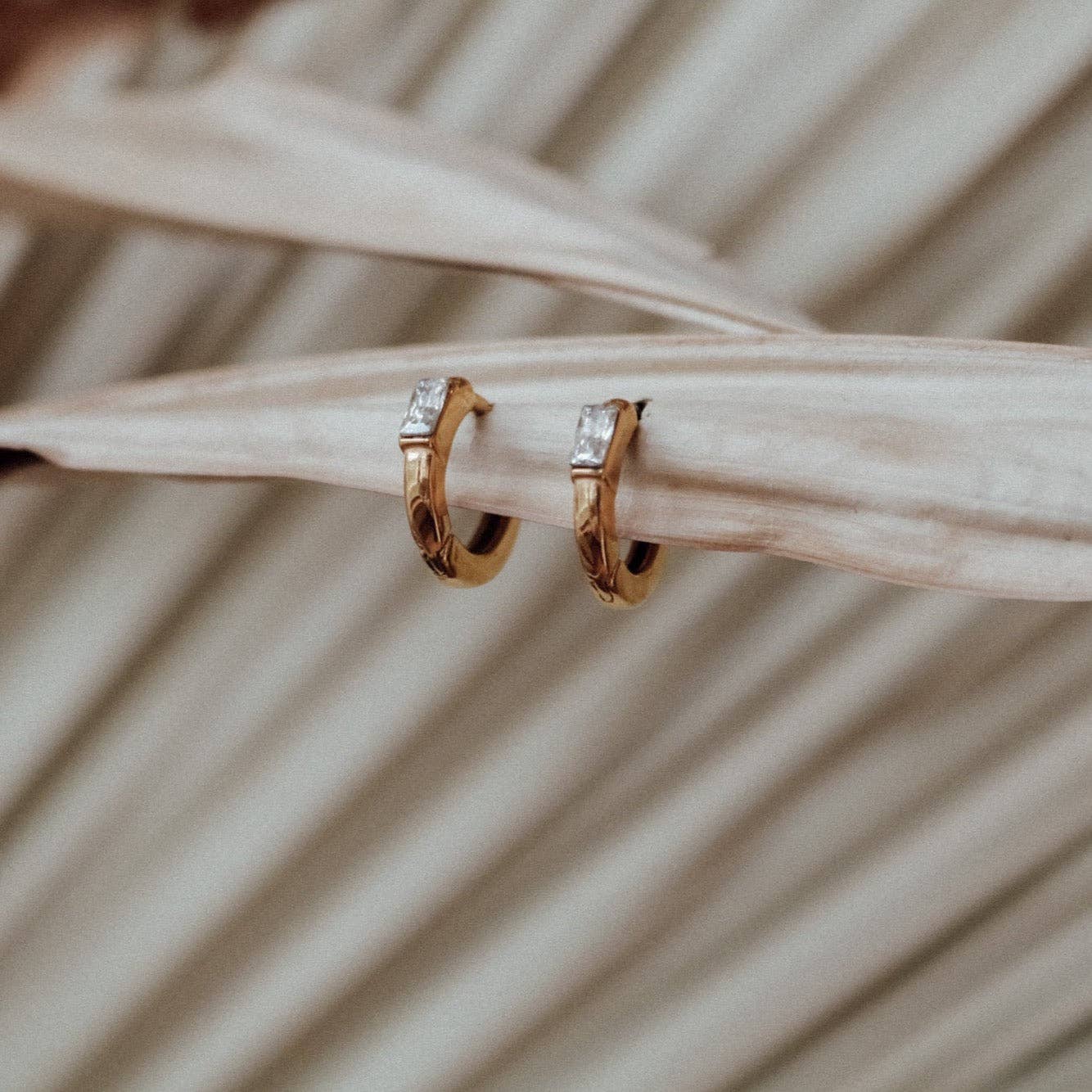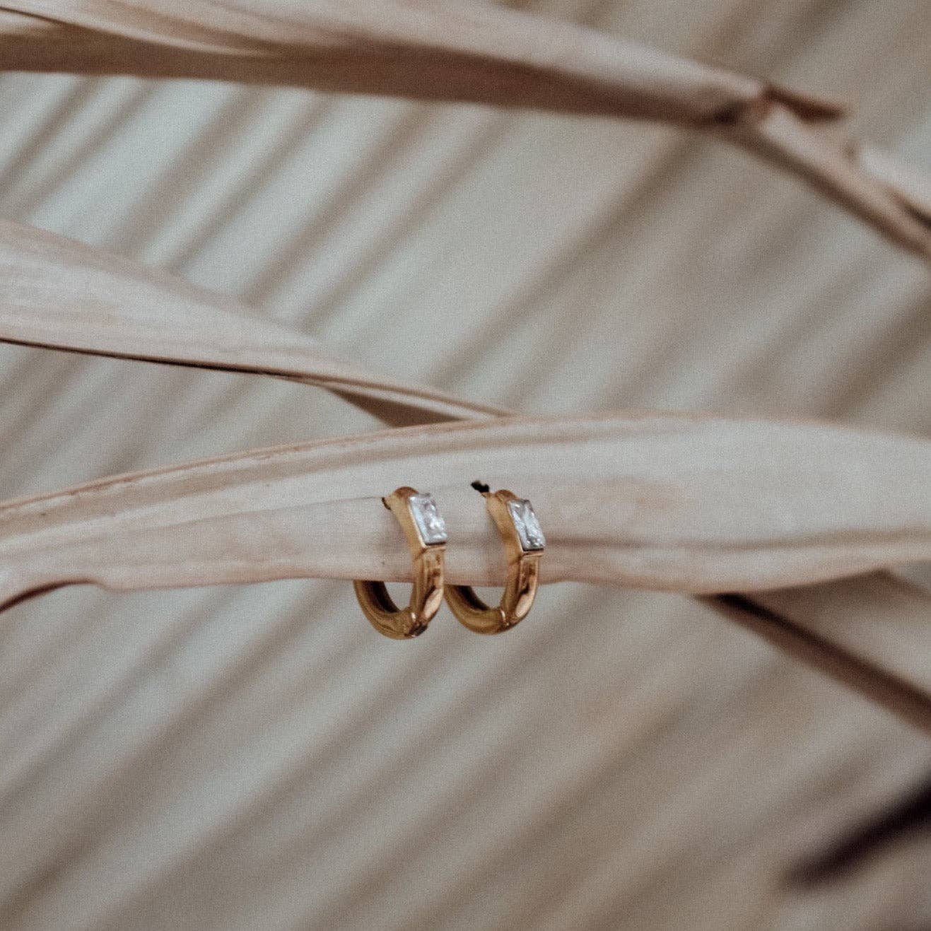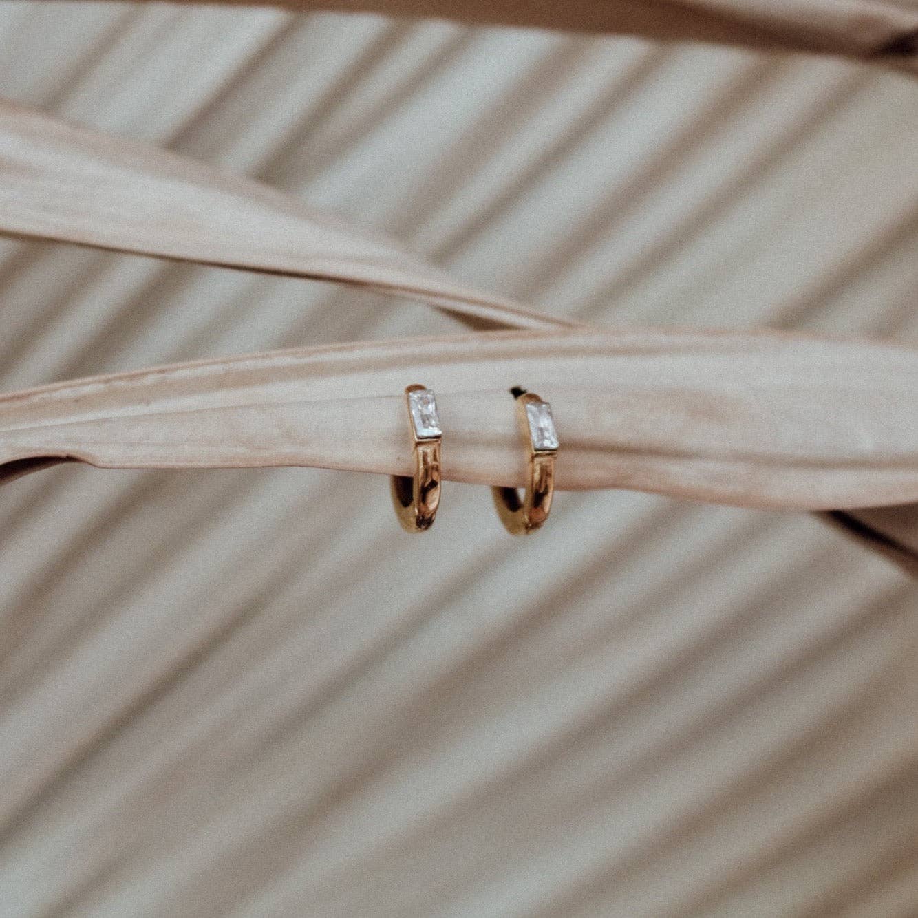 The perfect tiny everyday pair of huggies. These mini round hoops feature a single rectangle crystal. Minimalist and go with everything! * 18K gold plated on stainless steel * Approximately 1/4” * Tarnish resistant * Huggie style clip closure