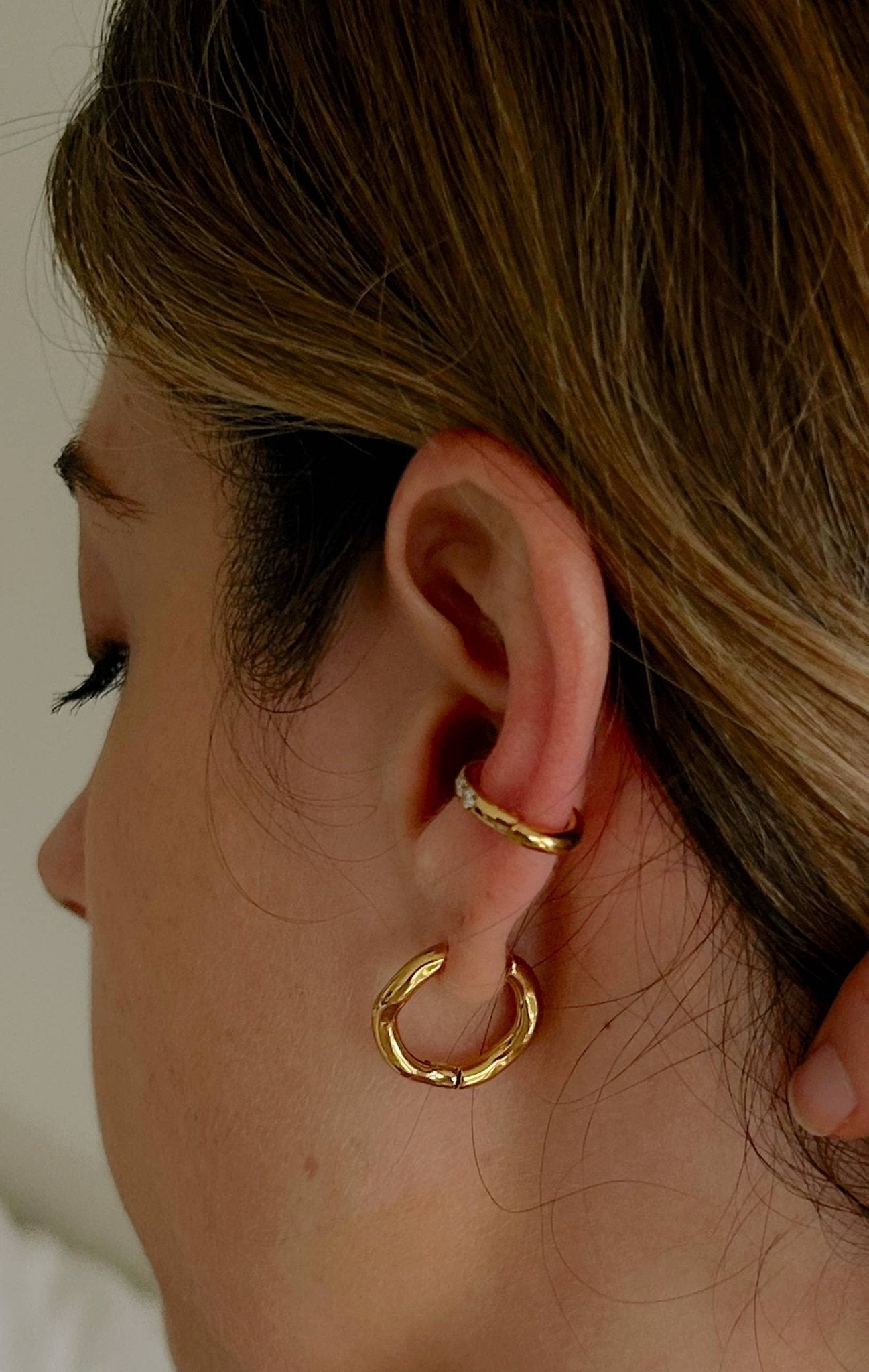 Our Sol Hoops are inspired by the sun… warm, golden and easy to wear. The wavy shape adds a subtle glow from every angle. Materials: 18K Gold over Stainless Steel using a long-lasting PVD finish; waterproof, tarnish-resistant and hypoallergenic