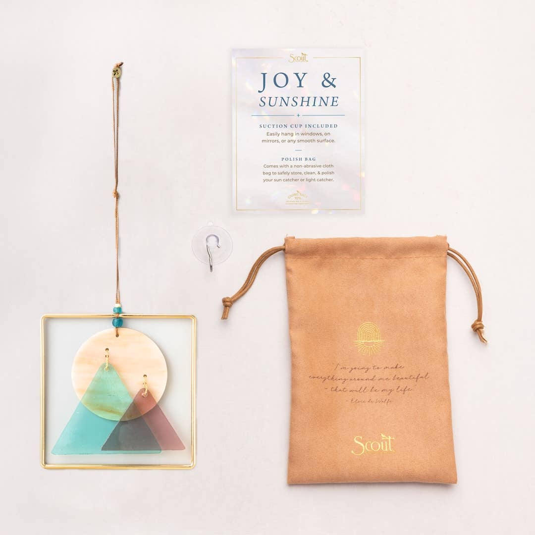 Each light catcher features hand-cut stained glass, carefully shaped and framed in graceful gold-plated brass. Available in one of four harmonious designs, every piece reflects a balance of craftsmanship and artistry. The stained glass panels glow brilliantly when touched by the sun, creating ever-changing reflections that shift throughout the day. Morning light offers a soft, gentle shimmer, while afternoon sun brings richer, more vibrant hues—ensuring the experience feels new and beautiful from hour to hour.