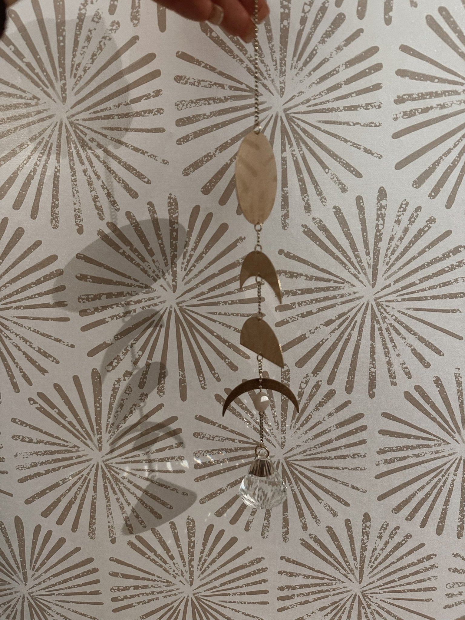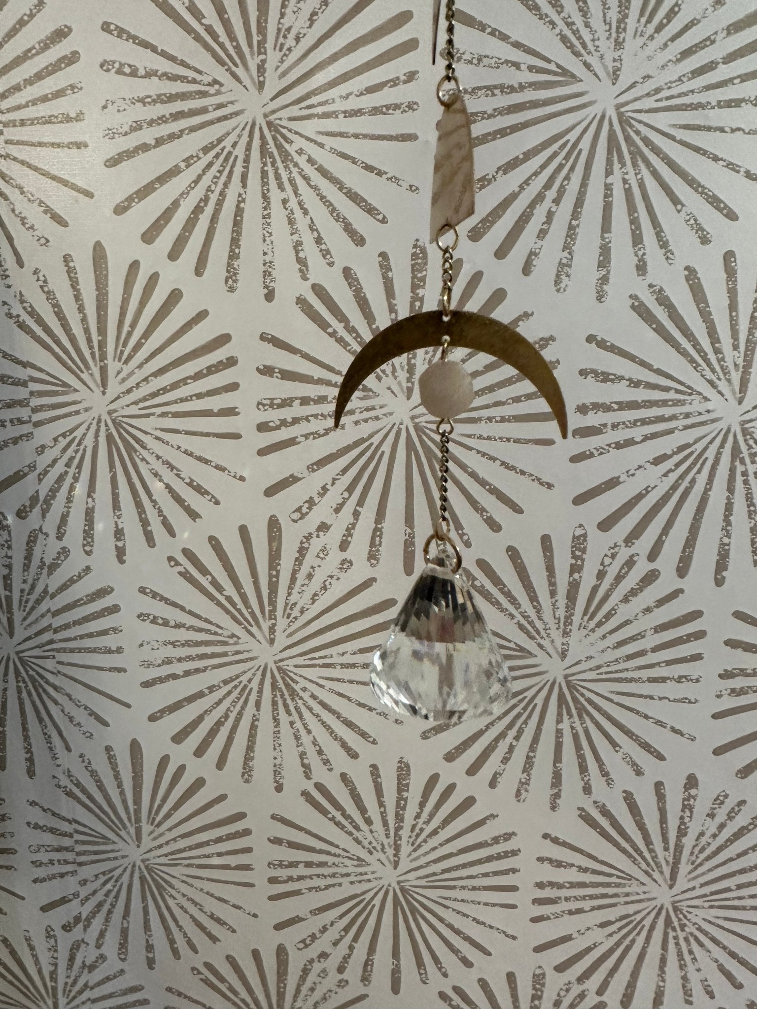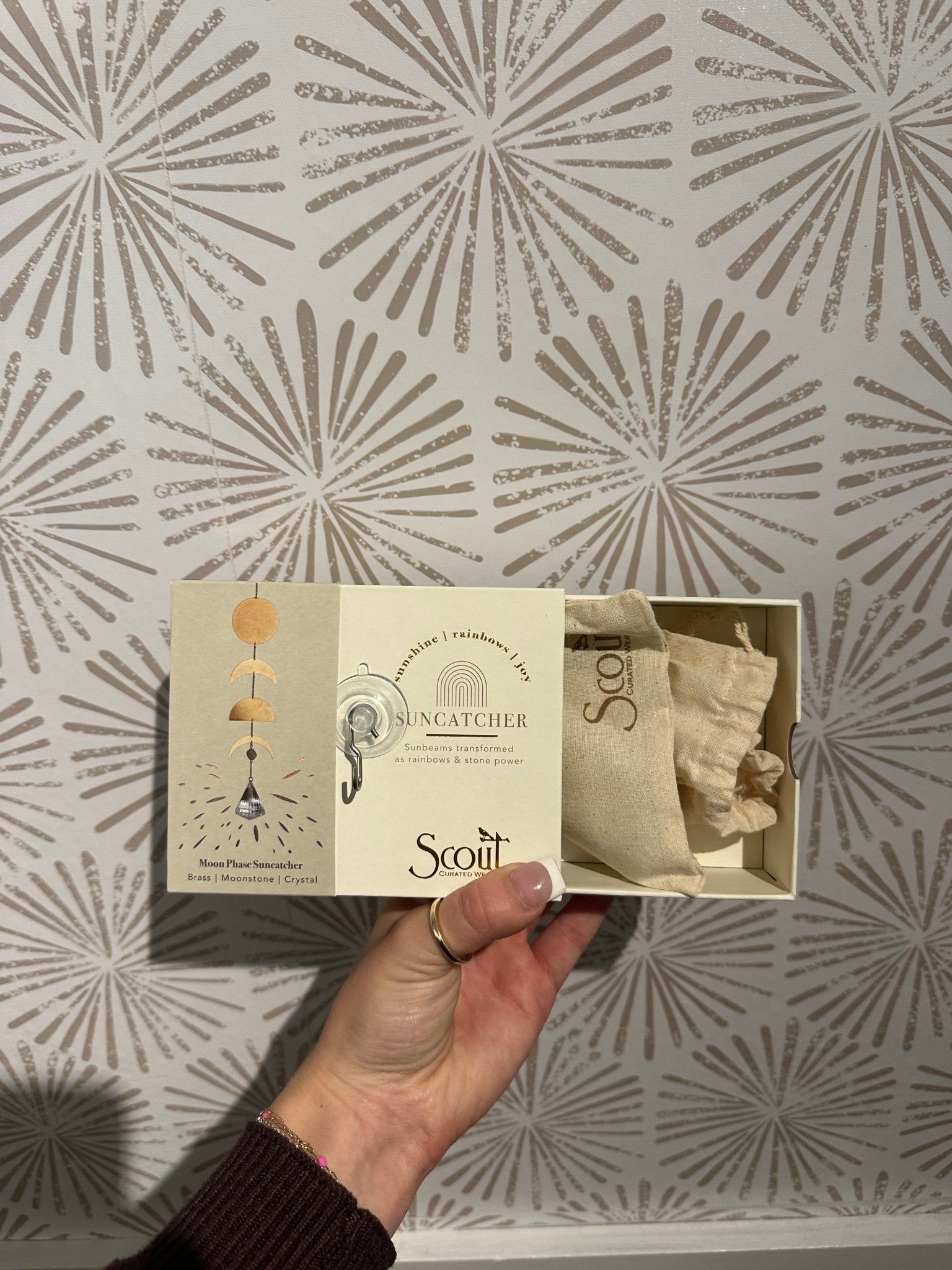 Each suncatcher is crafted from gold-plated brass, precision-cut crystal, and genuine moonstone—a gemstone known as the Stone of Balance. Long associated with intuition and inner peace, moonstone reflects the soothing glow of the moon, reminding us to embrace both calm and change. Its subtle shimmer pairs beautifully with the crystal’s prismatic brilliance, creating a captivating play of light and energy wherever it hangs.