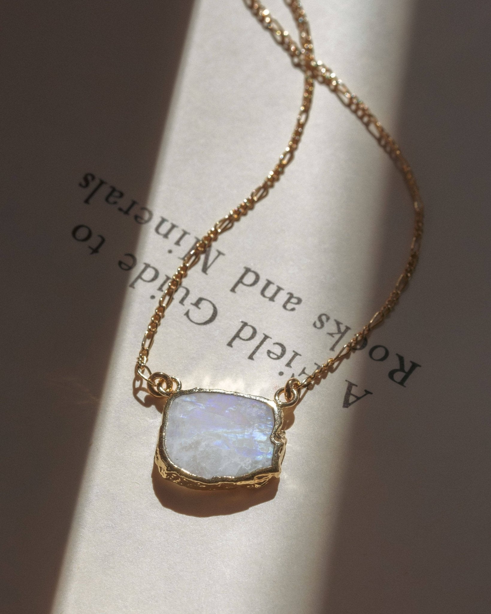 Celebrate individuality and natural beauty with this Raw Moonstone Pendant Necklace, a modern statement piece that balances organic texture with refined elegance. Each pendant is entirely unique, capturing the raw energy of nature while framed in luminous gold for a wearable piece that feels elevated yet grounded. Perfect for layering or as a standalone focal point, it’s an accessory that embodies authenticity and style.