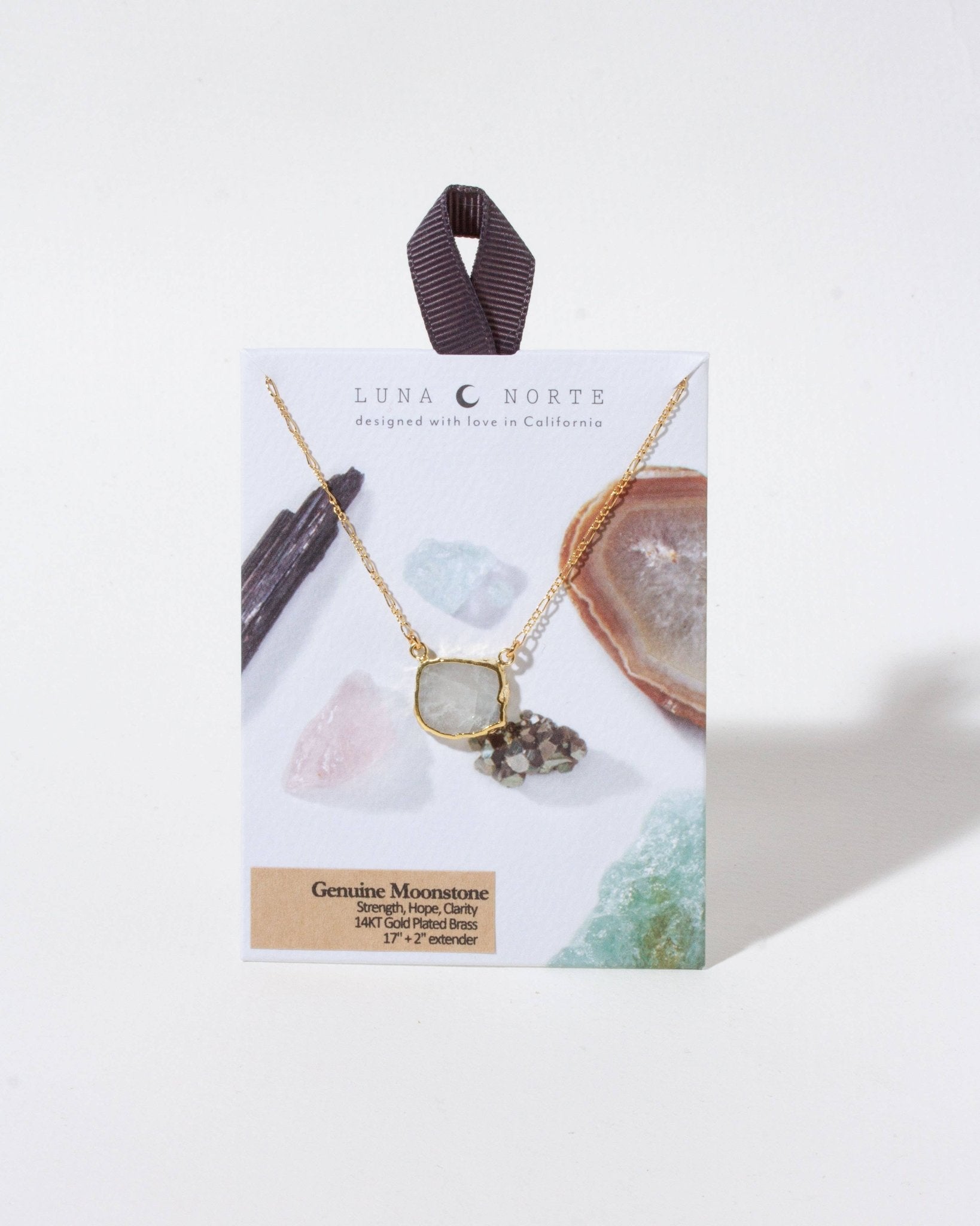 The combination of organic shape, luminous moonstone, and gleaming gold plating makes this necklace perfect for boutiques seeking jewelry that is both distinctive and accessible. Its aesthetic speaks to contemporary trends—natural, artisanal, and subtly luxe—while remaining classic enough to be loved for years to come. The envelope carding enhances presentation, making it an effortless gift-ready option.