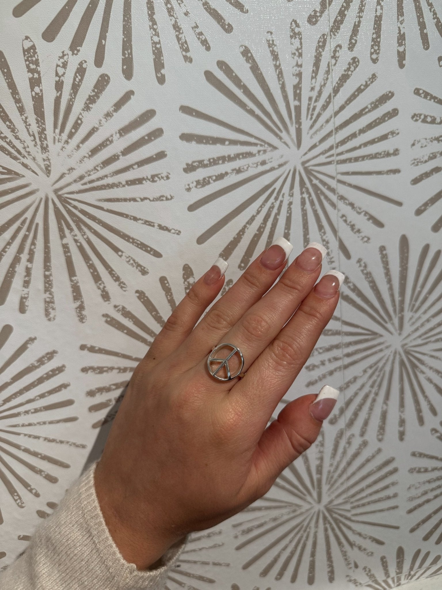 The centerpiece of this ring is the open peace sign, carefully crafted in sterling silver to create a lightweight yet bold design. Measuring approximately 5/8 inch tall, the peace symbol is prominent enough to be noticed while remaining comfortable on the finger. Its open design allows light to pass through, creating subtle dimension and visual interest while maintaining a sleek, modern aesthetic. This ring embodies a message of peace, unity, and optimism — values that resonate with wearers of all ages and styles.