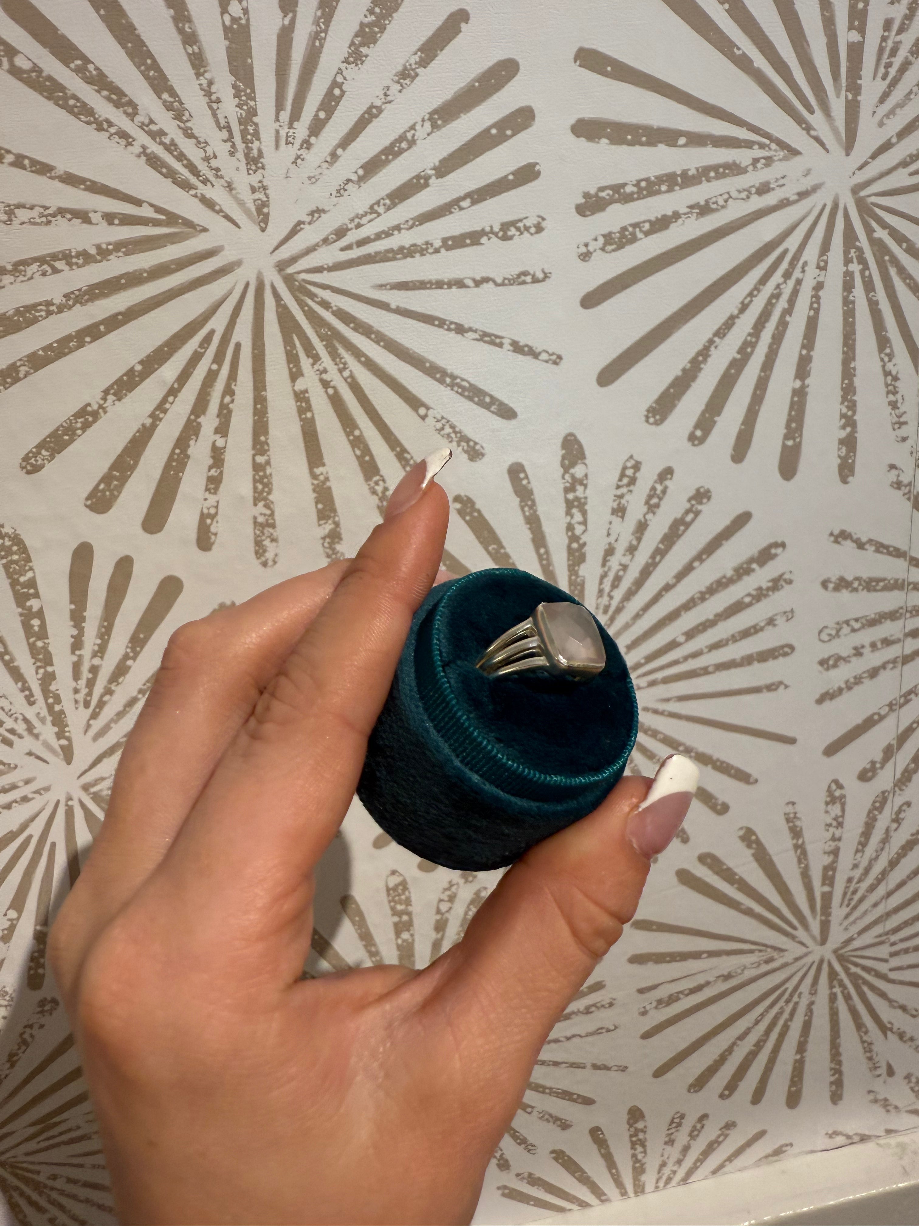 The ring is crafted from high-quality .925 sterling silver, ensuring durability, hypoallergenic wear, and long-lasting shine. Sterling silver is prized for its strength and timeless appeal, making it an ideal material for everyday wear while maintaining a polished and refined appearance. The band’s smooth finish complements the faceted rose quartz, highlighting its gentle color and geometric precision. This combination of premium materials and meticulous craftsmanship creates a versatile accessory that is perfect for casual, professional, or formal ensembles.