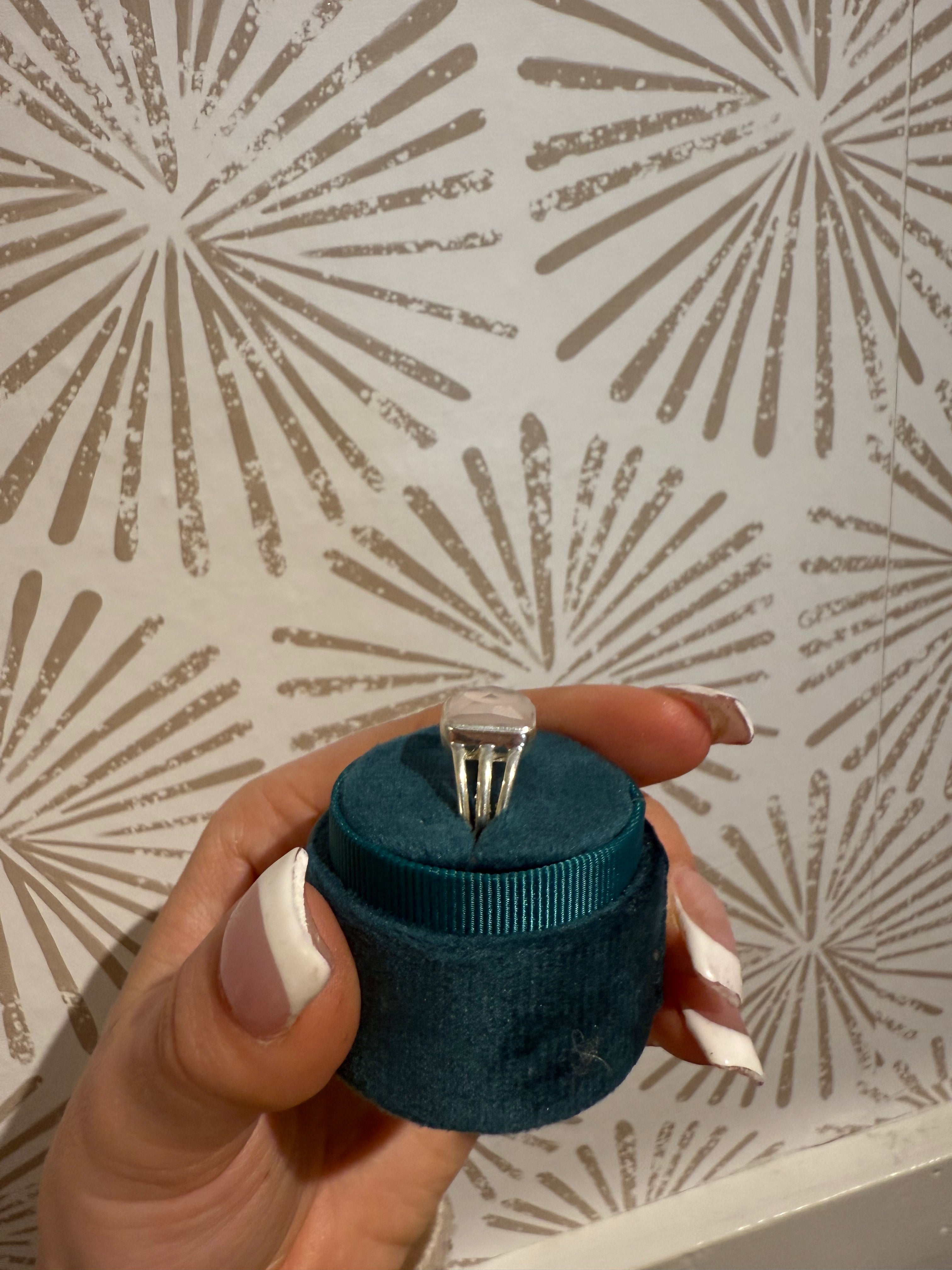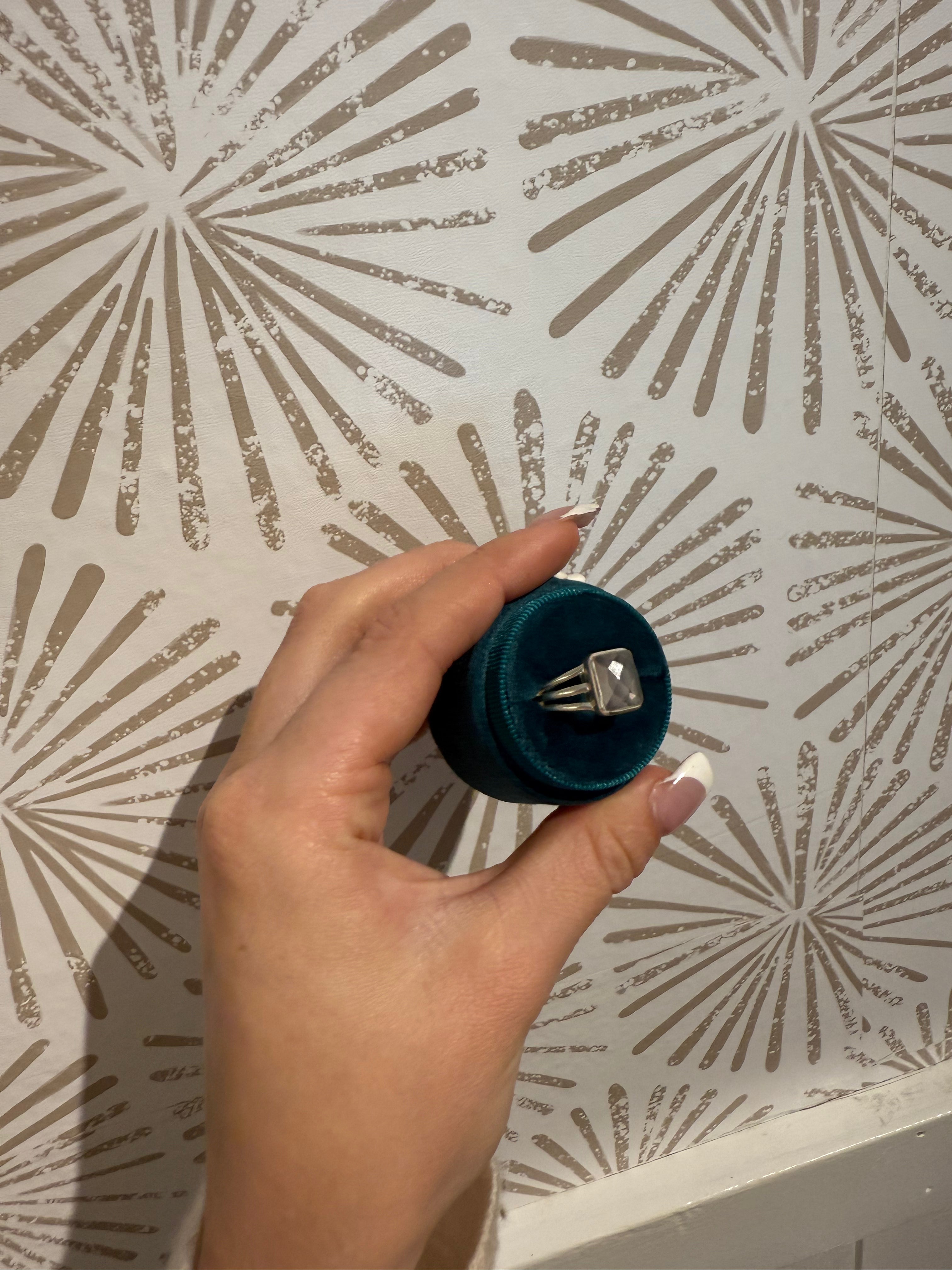 At the heart of the Rosie Ring is the checker-cut square rose quartz, celebrated for its soft pink hue and associations with love, compassion, and emotional balance. The checker cut enhances the natural shimmer and depth of the stone, allowing it to catch the light beautifully from every angle. Measuring approximately 1/2 inch across, the square stone is prominent enough to make a statement while maintaining a sophisticated, wearable design. Its sleek, modern shape pairs beautifully with the polished sterling silver band, offering a harmonious balance of contemporary style and natural elegance.