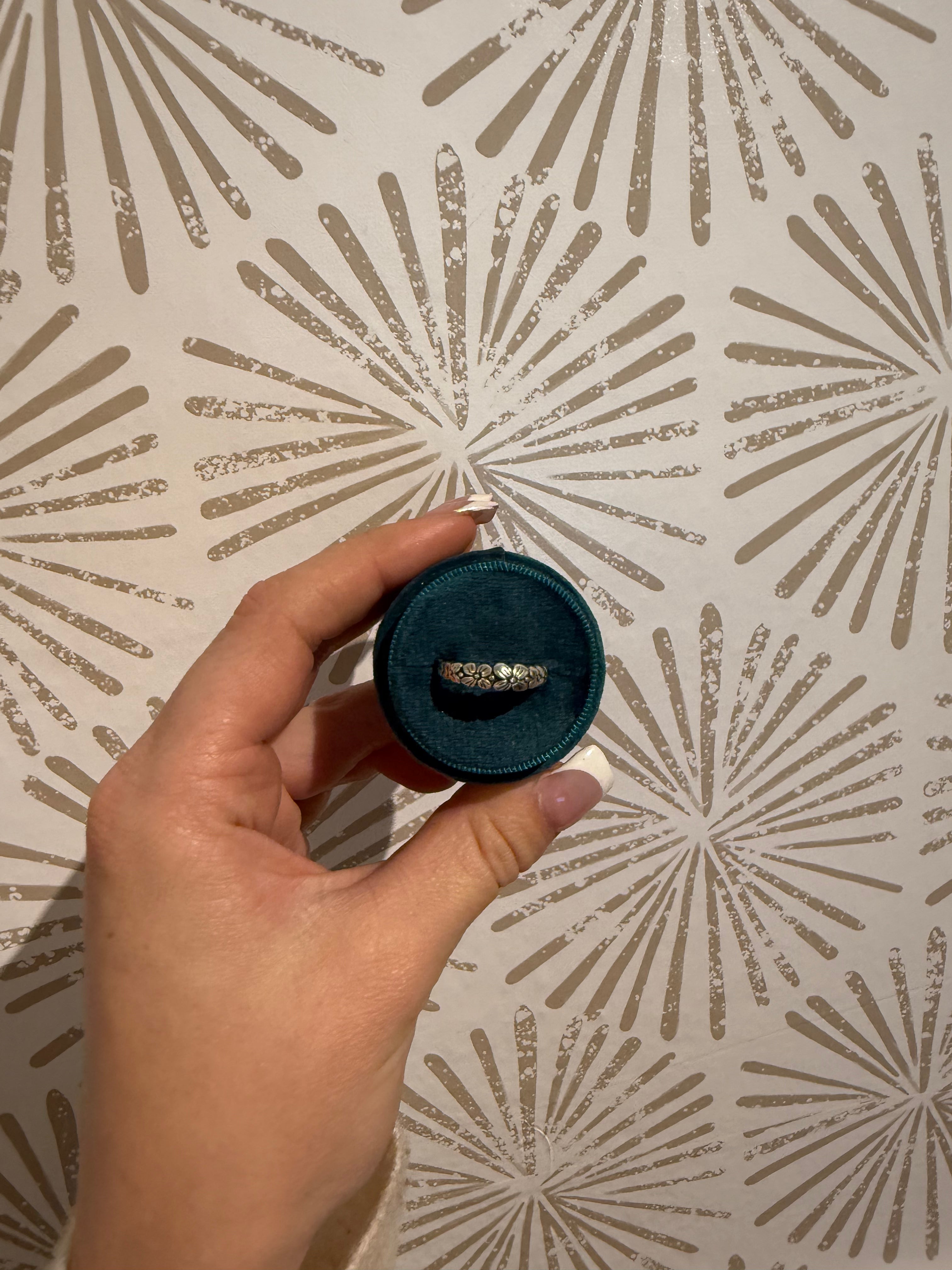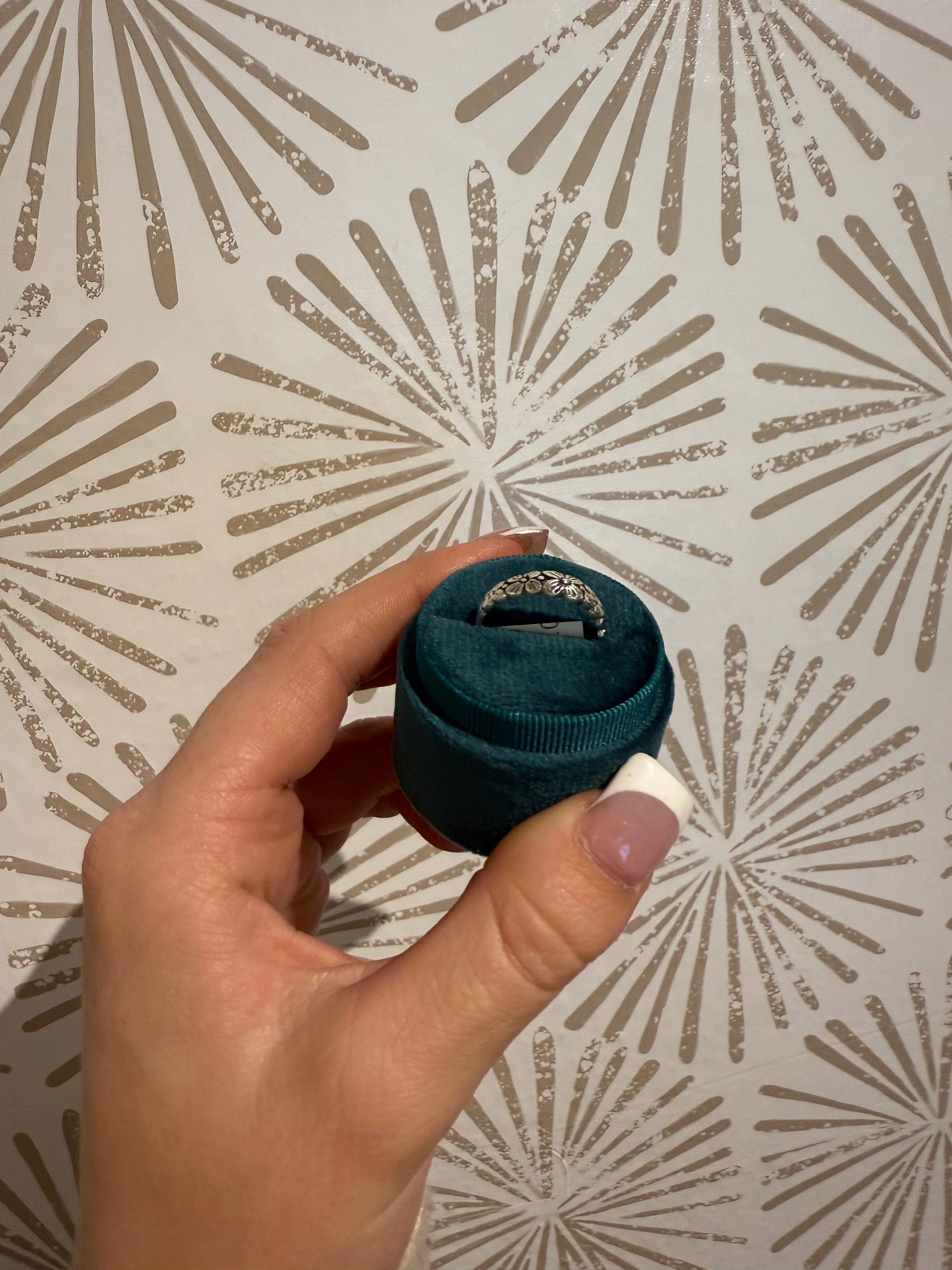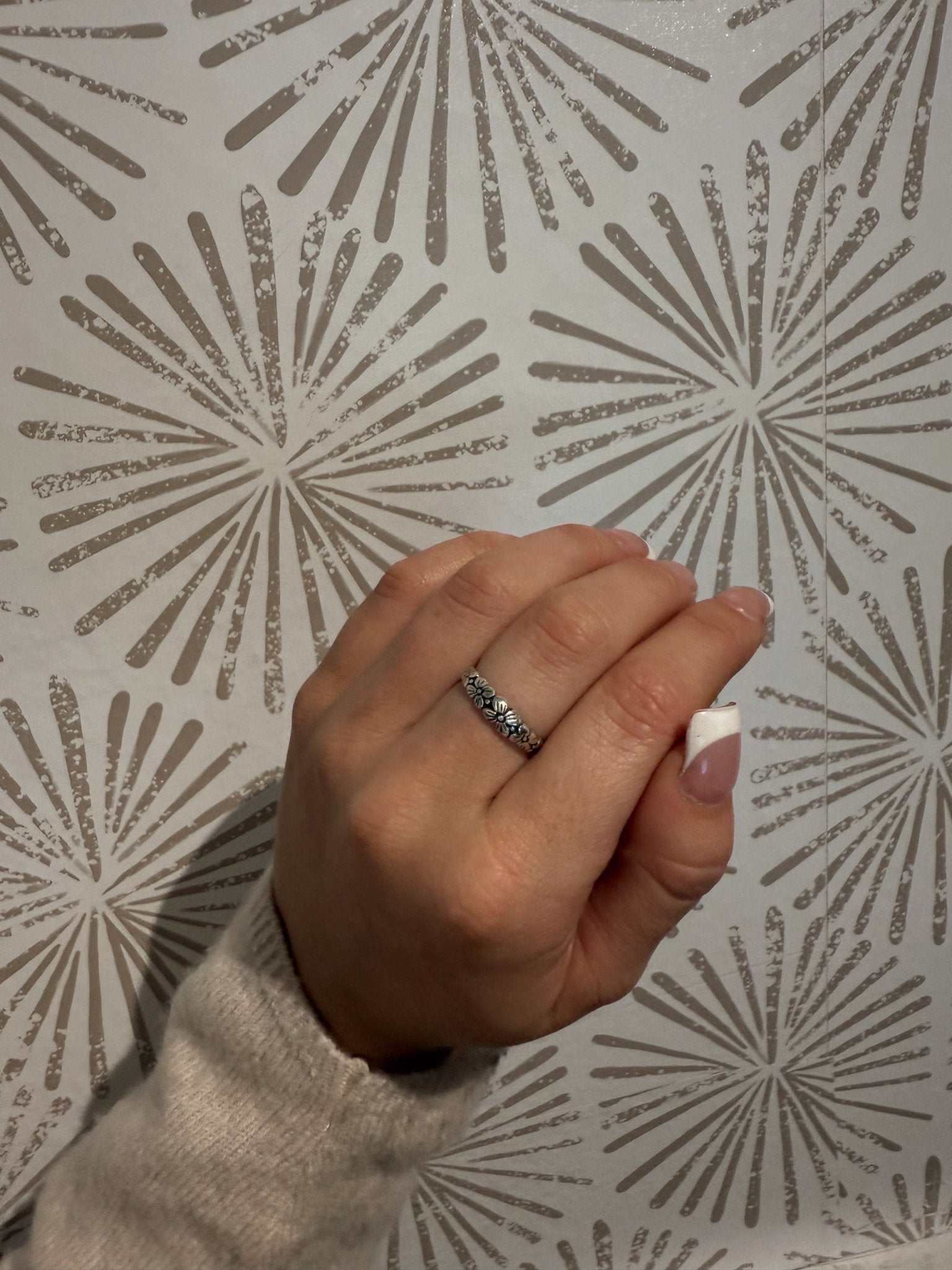 Bring a touch of springtime elegance to your jewelry collection with our Flowers in a Row Ring, a charming sterling silver band adorned with a continuous row of delicately sculpted flowers. This ring blends timeless floral beauty with minimalist design, creating a versatile piece that can be worn daily or as part of a curated stack. Perfect for nature lovers and those who appreciate meaningful, handcrafted jewelry, the Flowers in a Row Ring celebrates growth, joy, and feminine grace.
