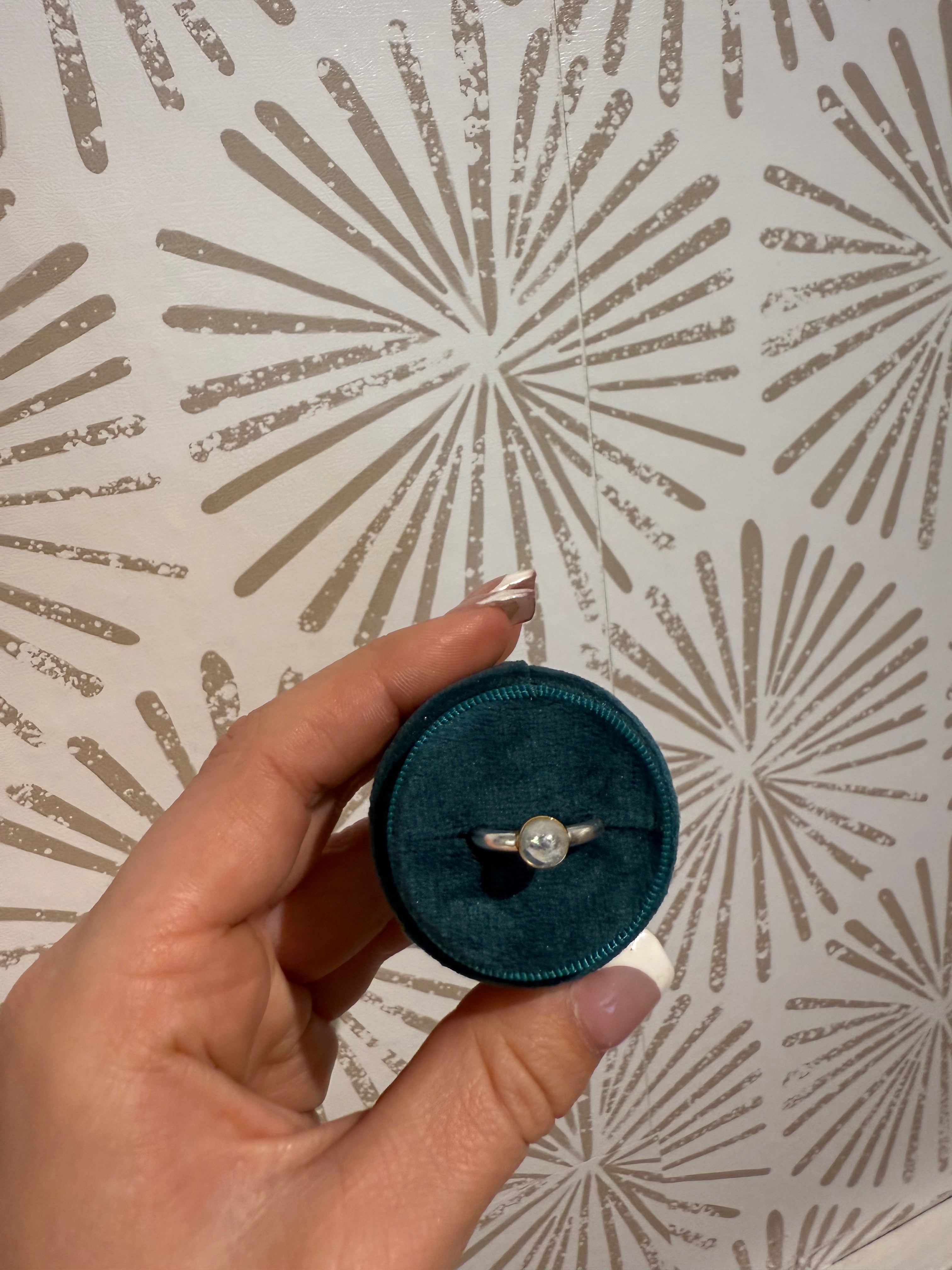 At the heart of the design is the rainbow moonstone, celebrated for its luminous sheen and rainbow-like flashes of color. Known as the stone of intuition, emotional balance, and inner clarity, moonstone carries a mystical quality that enhances personal growth and connection to the natural world. The gemstone is carefully set in a 14kt gold bezel, which adds warmth, elegance, and a modern touch to the sterling silver band. The bezel setting not only highlights the stone’s natural beauty but also provides durability and protection, ensuring the moonstone remains secure and radiant over time. Measuring approximately 1/4 inch, the stone is prominent enough to capture attention without overpowering the delicate 1/8 inch band, which provides a sleek, minimal silhouette that complements any style.