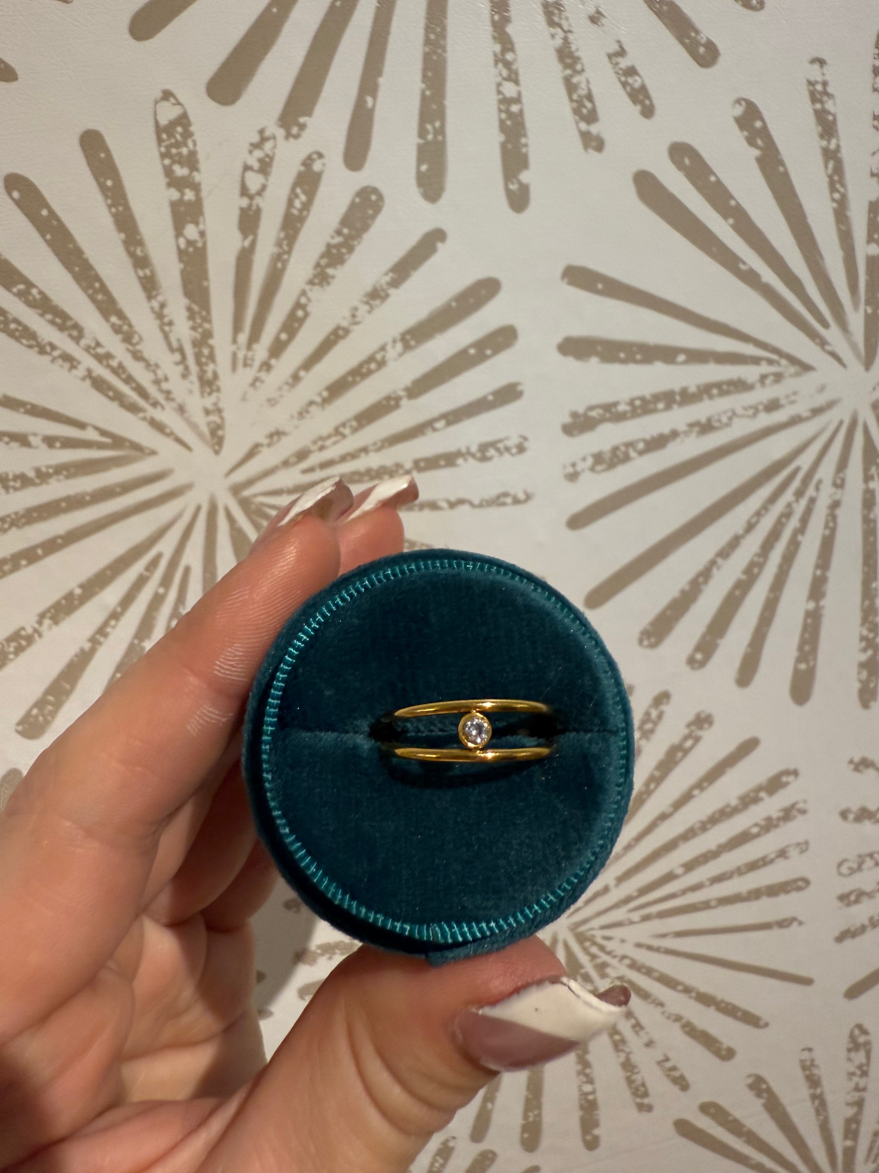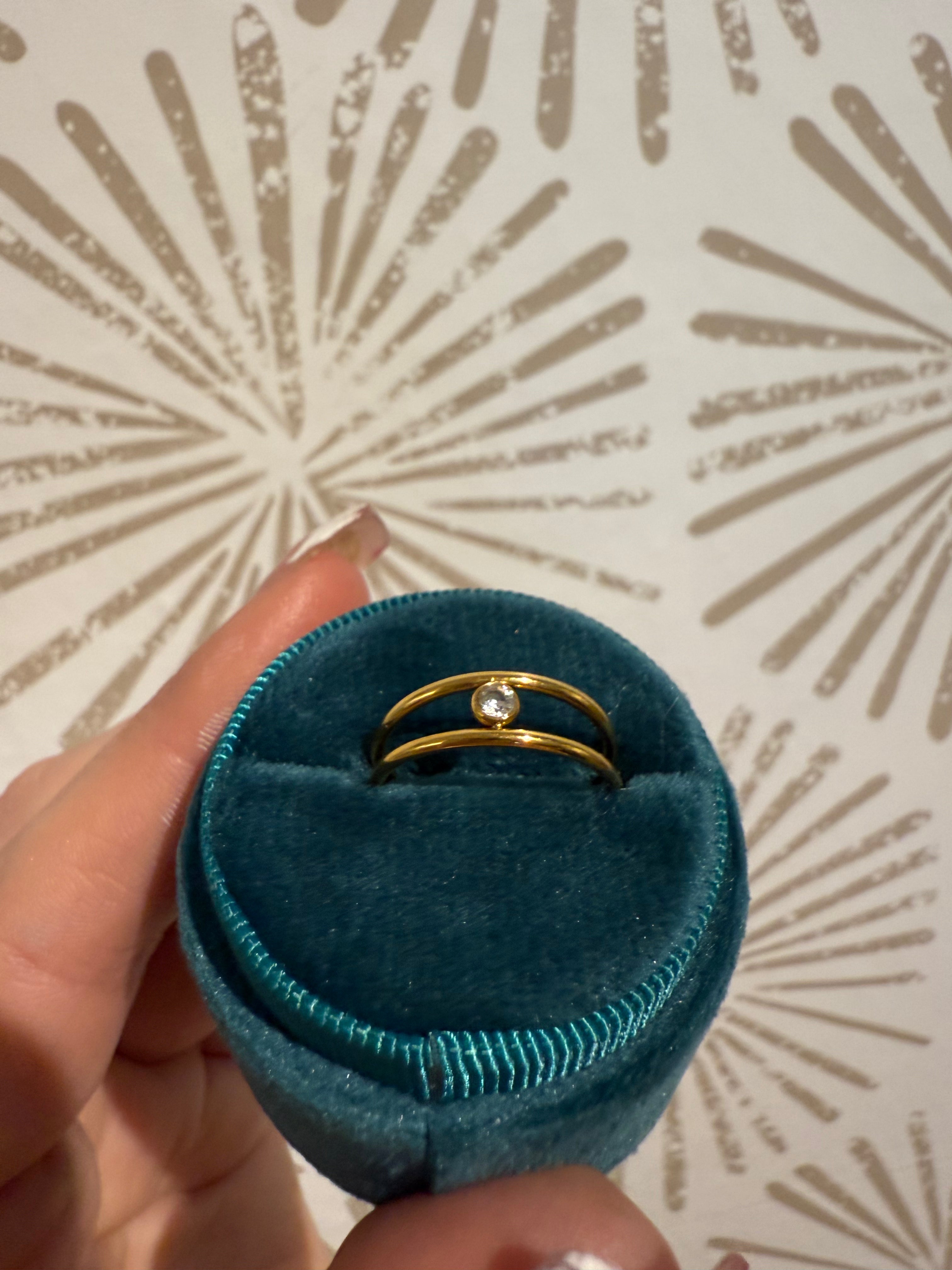 Crafted with care from high-quality stainless steel and plated in 18K gold, the Isadora Ring offers a rich, lasting finish that rivals fine jewelry. The smooth, mirror-like surface gleams with warmth and sophistication, while the dainty central stone — a brilliant diamond-like cubic zirconia — catches the light with just the right amount of sparkle. Together, they create a composition that feels delicate but enduring, feminine but strong.
