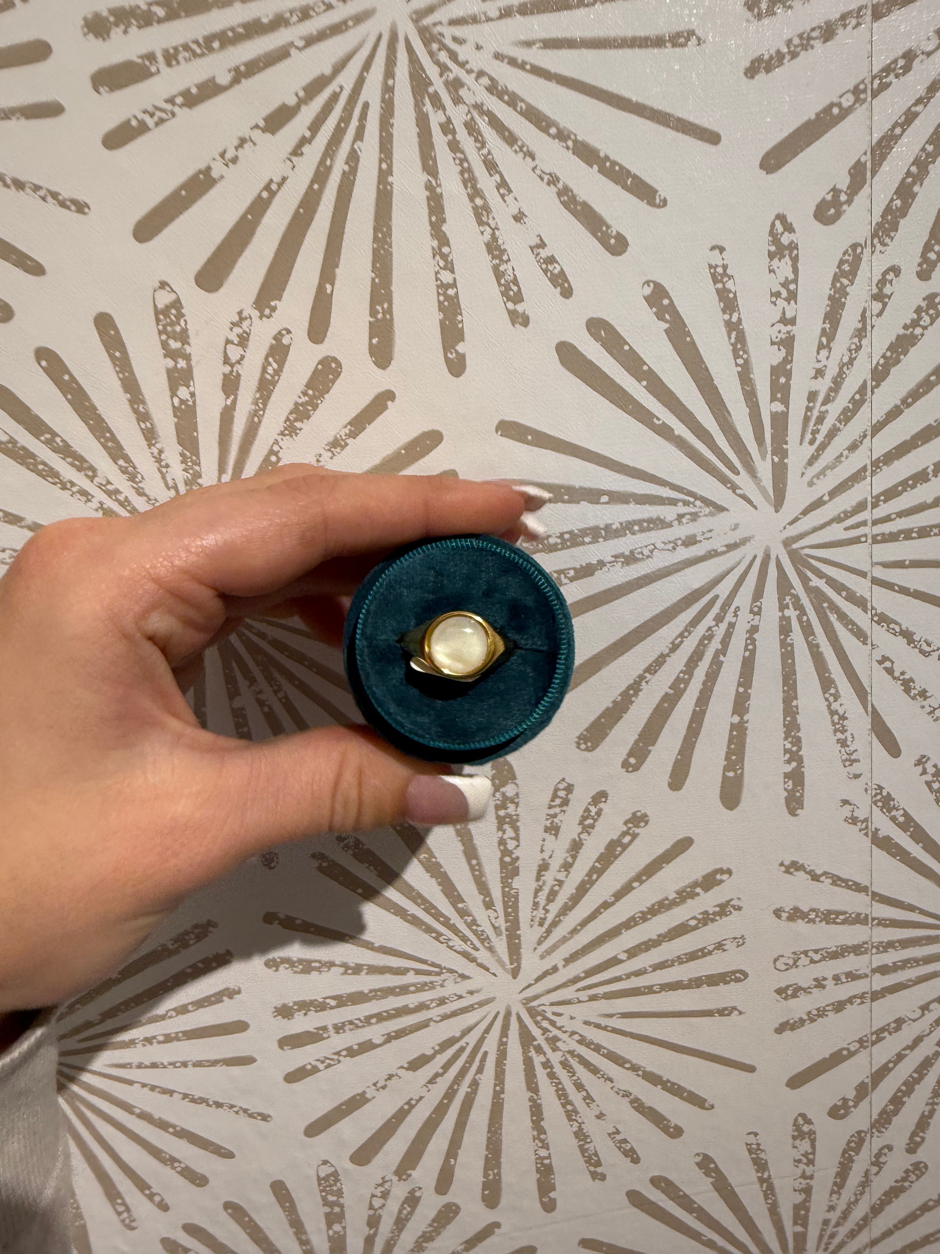The design of the Juno Ring is both bold and harmonious. Its circular shell centerpiece is carefully set to highlight its natural iridescence, allowing light to dance across its surface and reveal subtle shifts in tone. The gold band frames the shell perfectly, enhancing its natural colors while adding a touch of sophistication and glamour. The balance of organic and contemporary elements makes the Juno Ring versatile enough to complement a variety of styles, from casual chic to evening elegance. Its bold design ensures that it stands out, yet its refined craftsmanship makes it feel polished and timeless.