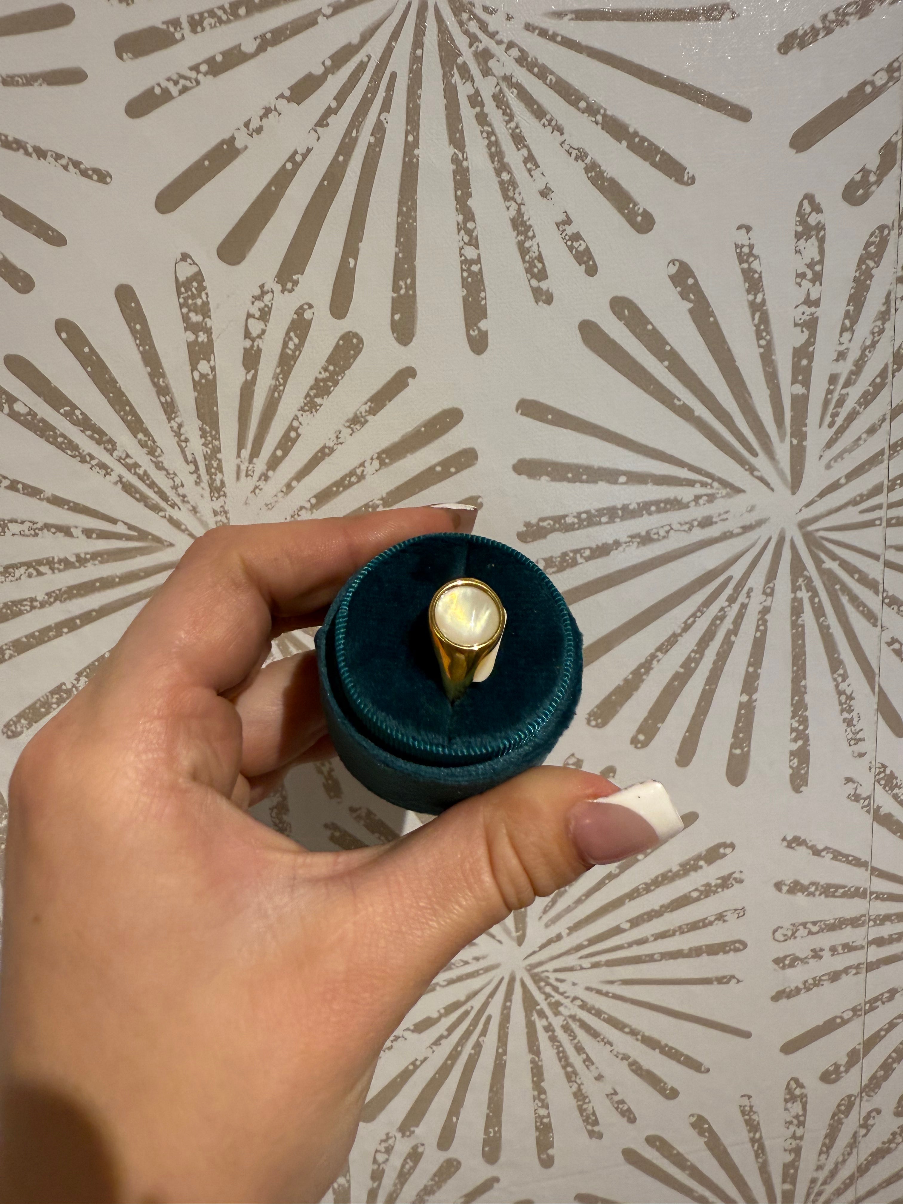 Bold, luminous, and unforgettable—the Juno Ring is a statement piece designed for those who love jewelry that captures attention effortlessly. At the heart of its striking design lies a circular iridescent shell, radiating a natural shimmer that shifts with every movement. The interplay of colors creates a mesmerizing effect, blending the organic beauty of nature with a modern, sophisticated elegance. Whether worn alone to make a singular statement or paired with other rings for a layered look, the Juno Ring is the ultimate accessory for those who embrace bold, contemporary style.
